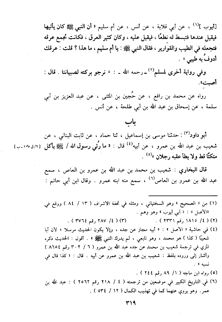 أَبُو دَاوُد: حَدثنَا مُوسَى بن إِسْمَاعِيل، ثَنَا حَمَّاد، عَن ثَابت الْبنانِيّ، عَن شُعَيْب بن عبد الله بن عَمْرو، عَن أَبِيه قَالَ: " مَا رئي رَسُول الله / - صَلَّى اللَّهُ عَلَيْهِ وَسَلَّم َ - يَأْكُل مُتكئا قطّ وَلَا يطَأ عقبه رجلَانِ ".