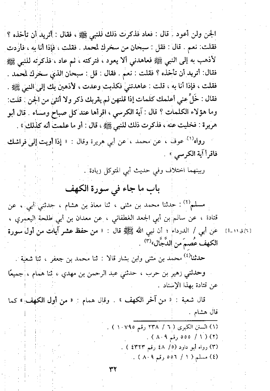مُسلم: حَدثنَا مُحَمَّد بن مثنى، ثَنَا معَاذ بن هِشَام، حَدثنِي أبي، عَن قَتَادَة، عَن سَالم بن أبي الْجَعْد الْغَطَفَانِي، عَن معدان بن أبي طَلْحَة الْيَعْمرِي، عَن أبي / الدَّرْدَاء؛ أَن نَبِي الله - صَلَّى اللَّهُ عَلَيْهِ وَسَلَّم َ - قَالَ: " من حفظ عشر آيَات من أول سُورَة الْكَهْف عصم من الدَّجَّال ".