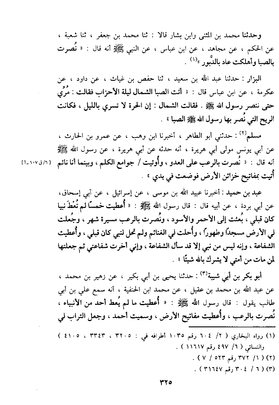مُسلم: حَدثنِي أَبُو الطَّاهِر، أخبرنَا ابْن وهب، عَن عَمْرو بن الْحَارِث، عَن أبي يُونُس مولى أبي هُرَيْرَة، أَنه حَدثهُ عَن أبي هُرَيْرَة، عَن رَسُول الله - صَلَّى اللَّهُ عَلَيْهِ وَسَلَّم َ - أَنه قَالَ: " نصرت بِالرُّعْبِ على الْعَدو، وَأُوتِيت / جَوَامِع الْكَلم، وبينما أَنا نَائِم أتيت بمفاتيح خَزَائِن الأَرْض فَوضعت فِي يَدي ".