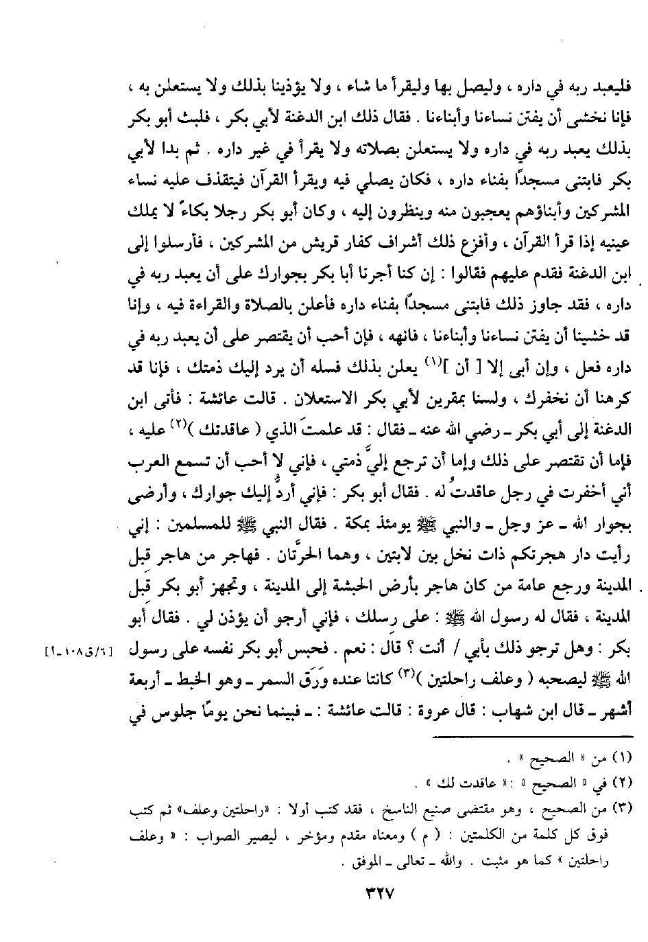فليعبد ربه فِي دَاره، وَليصل بهَا وليقرأ مَا شَاءَ، وَلَا يؤذينا بذلك لَا يستعلن بِهِ، فَإنَّا نخشى أَن يفتن نِسَاءَنَا وَأَبْنَاءَنَا. فَقَالَ ذَلِك ابْن الدغنة لأبي بكر، فَلبث أَبُو بكر بذلك يعبد ربه فِي دَاره وَلَا يستعلن بِصَلَاتِهِ وَلَا يقْرَأ فِي غير دَاره. ثمَّ بدا لأبي بكر فابتنى مَسْجِدا بِفنَاء دَاره، فَكَانَ يُصَلِّي فِيهِ وَيقْرَأ الْقُرْآن فيتقذف عَلَيْهِ نسَاء الْمُشْركين وأبناؤهم يعْجبُونَ مِنْهُ وَيَنْظُرُونَ إِلَيْهِ، وَكَانَ أَبُو بكر رجلا بكاء لَا يملك عَيْنَيْهِ إِذا قَرَأَ الْقُرْآن، وأفزع ذَلِك أَشْرَاف كفار قُرَيْش من الْمُشْركين، فأرسلوا إِلَى ابْن الدغنة فَقدم عَلَيْهِم فَقَالُوا: إِن كُنَّا أجرنا أَبَا بكر بجوارك على أَن يعبد ربه فِي دَاره، فقد جَاوز ذَلِك فابتنى مَسْجِدا بِفنَاء دَاره فأعلن بِالصَّلَاةِ وَالْقِرَاءَة فِيهِ، وَإِنَّا قد خشينا أَن يفتن نِسَاءَنَا وَأَبْنَاءَنَا، فانهه، فَإِن فَإِن أحب أَن يقْتَصر على أَن يعبد ربه فِي دَاره فعل، وَإِن أَبى إِلَّا [أَن] يعلن بذلك فسله أَن يرد إِلَيْك ذِمَّتك، فَإنَّا قد كرهنا أَن نخفرك، ولسنا بمقرين لأبي بكر الاستعلان. قَالَت عَائِشَة: فَأتى ابْن الدغنة إِلَى أبي بكر - رَضِي الله عَنهُ - فَقَالَ: قد علمت الَّذِي (عاقدتك) عَلَيْهِ، فإمَّا أَن تقتصر على ذَلِك وَإِمَّا أَن ترجع إِلَيّ ذِمَّتِي، فَإِنِّي لَا أحب أَن تسمع الْعَرَب أَنِّي أخفرت فِي رجل عاقدت لَهُ. فَقَالَ أَبُو بكر: فَإِنِّي أرد إِلَيْك جوارك، وأرضى بجوار الله - عز وَجل - وَالنَّبِيّ - صَلَّى اللَّهُ عَلَيْهِ وَسَلَّم َ - يَوْمئِذٍ بِمَكَّة. فَقَالَ النَّبِي - صَلَّى اللَّهُ عَلَيْهِ وَسَلَّم َ - للْمُسلمين: إِنِّي رَأَيْت دَار هجرتكم ذَات نخل بَين لابتين، وهما الحرتان. فَهَاجَرَ من هَاجر قبل الْمَدِينَة وَرجع عَامَّة من كَانَ هَاجر بِأَرْض الْحَبَشَة إِلَى الْمَدِينَة، وتجهز أَبُو بكر قبل الْمَدِينَة، فَقَالَ لَهُ رَسُول الله - صَلَّى اللَّهُ عَلَيْهِ وَسَلَّم َ -: على رسلك، فَإِنِّي أَرْجُو أَن يُؤذن لي. فَقَالَ أَبُو بكر: وَهل ترجو ذَلِك بِأبي / أَنْت؟ قَالَ: نعم. فحبس أَبُو بكر نَفسه على رَسُول الله - صَلَّى اللَّهُ عَلَيْهِ وَسَلَّم َ - ليصحبه (وعلف راحلتين) كَانَتَا عِنْده ورق السمر - وَهُوَ الْخبط - أَرْبَعَة أشهر - قَالَ ابْن شهَاب: قَالَ عُرْوَة: قَالَت عَائِشَة: - فَبَيْنَمَا نَحن يَوْمًا جُلُوس فِي