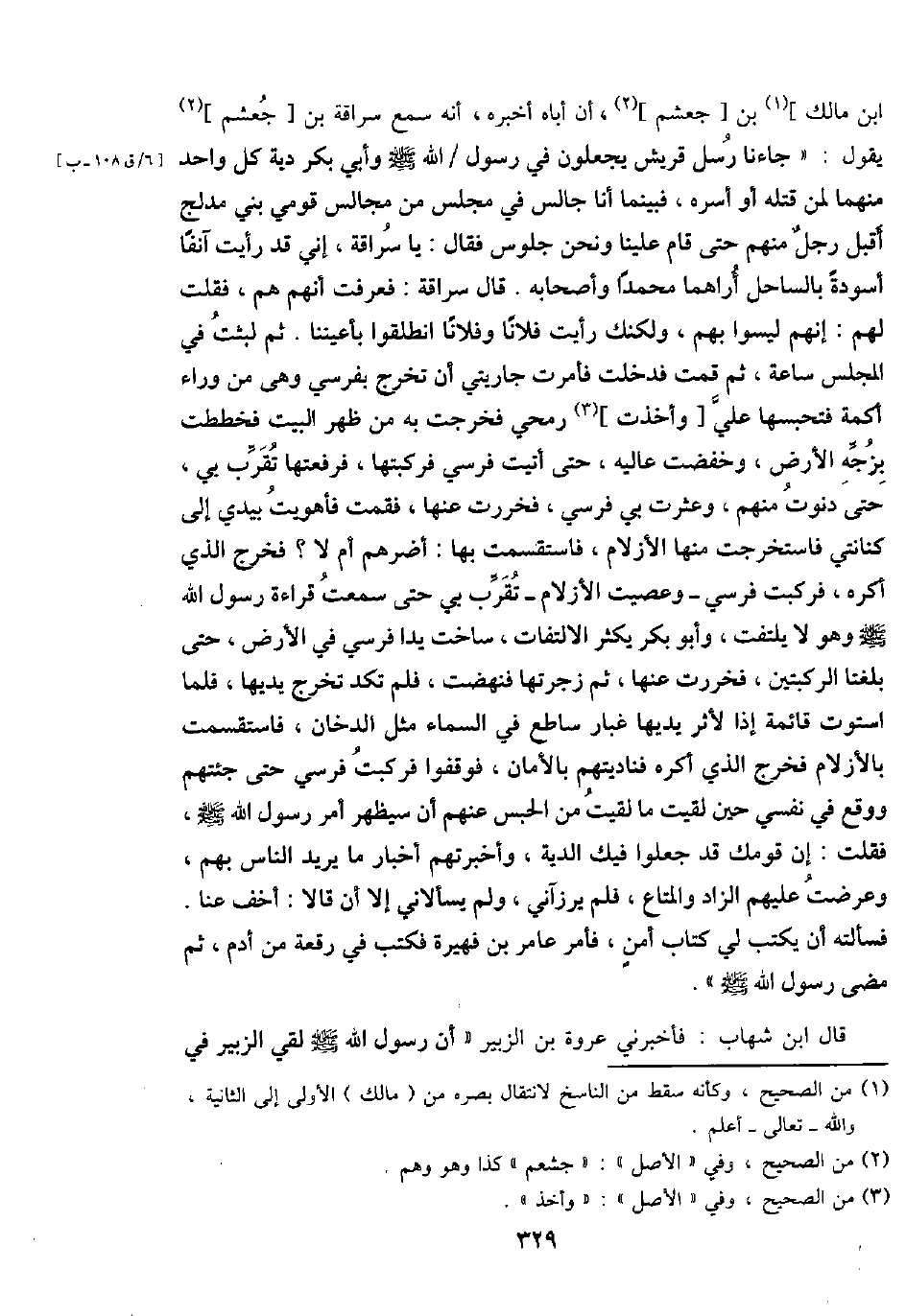 ابْن مَالك] بن [جعْشم] ، أَن أَبَاهُ أخبرهُ، أَنه سمع سراقَة بن [جعْشم] يَقُول: " جَاءَنَا رسل قُرَيْش يجْعَلُونَ فِي رَسُول / الله - صَلَّى اللَّهُ عَلَيْهِ وَسَلَّم َ - وَأبي بكر دِيَة كل وَاحِد مِنْهُمَا لمن قَتله أَو أسره، فَبَيْنَمَا أَنا جَالس فِي مجْلِس من مجَالِس قومِي بني مُدْلِج أقبل رجل مِنْهُم حَتَّى قَامَ علينا وَنحن جُلُوس فَقَالَ: يَا سراقَة، إِنِّي قد رَأَيْت آنِفا أَسْوِدَة بالسَّاحل أراهما مُحَمَّدًا وَأَصْحَابه. قَالَ سراقَة: فَعرفت أَنهم هم، فَقلت لَهُم: إِنَّهُم لَيْسُوا بهم، وَلَكِنَّك رَأَيْت فلَانا وَفُلَانًا انْطَلقُوا بأعيننا. ثمَّ لَبِثت فِي الْمجْلس سَاعَة، ثمَّ قُمْت فَدخلت فَأمرت جاريتي أَن تخرج بفرسي وَهِي من وَرَاء أكمة فتحبسها عَليّ [وَأخذت] رُمْحِي فَخرجت بِهِ من ظهر الْبَيْت فخططت بزجه الأَرْض، وخفضت عاليه، حَتَّى أتيت فرسي فركبتها، فرفعتها تقرب بِي، حَتَّى دَنَوْت مِنْهُم، وعثرت بِي فرسي، فَخَرَرْت عَنْهَا، فَقُمْت فَأَهْوَيْت بيَدي إِلَى كِنَانَتِي فاستخرجت مِنْهَا الأزلام، فاستقسمت بهَا: أضرهم أم لَا؟ فَخرج الَّذِي أكره، فركبت فرسي - وعصيت الأزلام - تقرب بِي حَتَّى سَمِعت قِرَاءَة رَسُول الله - صَلَّى اللَّهُ عَلَيْهِ وَسَلَّم َ - وَهُوَ لَا يلْتَفت، وَأَبُو بكر يكثر الِالْتِفَات، ساخت يدا فرسي فِي الأَرْض، حَتَّى بلغتا الرُّكْبَتَيْنِ، فَخَرَرْت عَنْهَا، ثمَّ زجرتها فَنَهَضت، فَلم تكد تخرج يَديهَا، فَلَمَّا اسْتَوَت قَائِمَة إِذا لأثر يَديهَا غُبَار سَاطِع فِي السَّمَاء مثل الدُّخان، فاستقسمت بالأزلام فَخرج الَّذِي أكره فناديتهم بالأمان، فوقفوا فركبت فرسي حَتَّى جئتهم وَوَقع فِي نَفسِي حِين لقِيت مَا لقِيت من الْحَبْس عَنْهُم أَن سَيظْهر أَمر رَسُول الله - صَلَّى اللَّهُ عَلَيْهِ وَسَلَّم َ -، فَقلت: إِن قَوْمك قد جعلُوا فِيك الدِّيَة، وَأَخْبَرتهمْ أَخْبَار مَا يُرِيد النَّاس بهم، وَعرضت عَلَيْهِم الزَّاد وَالْمَتَاع، فَلم يرزآني، وَلم يسألاني إِلَّا أَن قَالَا: أخف عَنَّا. فَسَأَلته أَن يكْتب لي كتاب أَمن، فَأمر عَامر بن فهَيْرَة فَكتب فِي رقْعَة من أَدَم، ثمَّ مضى رَسُول الله - صَلَّى اللَّهُ عَلَيْهِ وَسَلَّم َ - ".