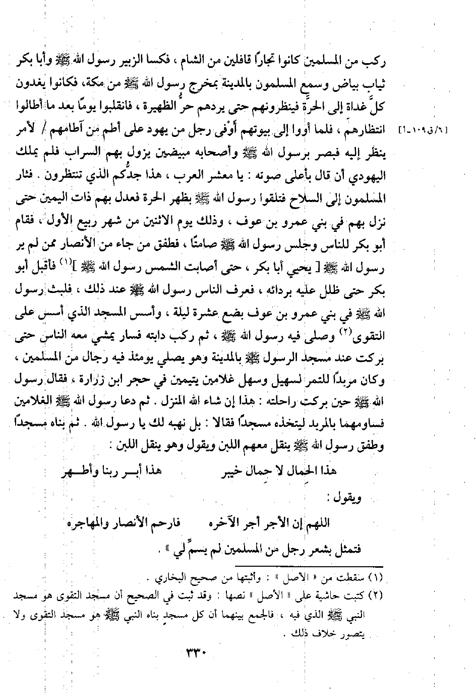 ركب من الْمُسلمين كَانُوا تجارًا قافلين من الشَّام، فكسا الزبير رَسُول الله - صَلَّى اللَّهُ عَلَيْهِ وَسَلَّم َ - وَأَبا بكر ثِيَاب بَيَاض وَسمع الْمُسلمُونَ بِالْمَدِينَةِ بمخرج رَسُول الله - صَلَّى اللَّهُ عَلَيْهِ وَسَلَّم َ - من مَكَّة، فَكَانُوا يَغْدُونَ كل غَدَاة إِلَى الْحرَّة فينظرونهم حَتَّى يردهم حر الظهيرة، فانقلبوا يَوْمًا بعد مَا أطالوا انتظارهم، فَلَمَّا أووا إِلَى بُيُوتهم أوفى رجل من يهود على أَطَم من آطامهم / لأمر ينظر إِلَيْهِ فَبَصر برَسُول الله - صَلَّى اللَّهُ عَلَيْهِ وَسَلَّم َ - وَأَصْحَابه مبيضين يَزُول بهم السراب فَلم يملك الْيَهُودِيّ أَن قَالَ بِأَعْلَى صَوته: يَا معشر الْعَرَب، هَذَا جدكم الَّذِي تنتظرون. فثار الْمُسلمُونَ إِلَى السِّلَاح فتلقوا رَسُول الله - صَلَّى اللَّهُ عَلَيْهِ وَسَلَّم َ - بِظهْر الْحرَّة فَعدل بهم ذَات الْيَمين حَتَّى نزل بهم فِي بني عَمْرو بن عَوْف، وَذَلِكَ يَوْم الِاثْنَيْنِ من شهر ربيع الأول، فَقَامَ أَبُو بكر للنَّاس وَجلسَ رَسُول الله - صَلَّى اللَّهُ عَلَيْهِ وَسَلَّم َ - صامتا، فَطَفِقَ من جَاءَ من الْأَنْصَار مِمَّن لم ير رَسُول الله - صَلَّى اللَّهُ عَلَيْهِ وَسَلَّم َ -[يحيي أَبَا بكر، حَتَّى أَصَابَت الشَّمْس رَسُول الله - صَلَّى اللَّهُ عَلَيْهِ وَسَلَّم َ -] فَأقبل أَبُو بكر حَتَّى ظلل عَلَيْهِ بردائه، فَعرف النَّاس رَسُول الله - صَلَّى اللَّهُ عَلَيْهِ وَسَلَّم َ - عِنْد ذَلِك، فَلبث رَسُول الله - صَلَّى اللَّهُ عَلَيْهِ وَسَلَّم َ - فِي بني عَمْرو بن عَوْف بضع عشرَة لَيْلَة، وَأسسَ الْمَسْجِد الَّذِي أسس على التَّقْوَى وَصلى فِيهِ رَسُول الله - صَلَّى اللَّهُ عَلَيْهِ وَسَلَّم َ -، ثمَّ ركب دَابَّته فَسَار يمشي مَعَه النَّاس حَتَّى بَركت عِنْد مَسْجِد الرَّسُول الله - صَلَّى اللَّهُ عَلَيْهِ وَسَلَّم َ - بِالْمَدِينَةِ وَهُوَ يُصَلِّي يَوْمئِذٍ فِيهِ رجال من الْمُسلمين، وَكَانَ مربدا للتمر لسهيل وَسَهل غلامين يتيمين فِي حجر ابْن زُرَارَة، فَقَالَ رَسُول الله - صَلَّى اللَّهُ عَلَيْهِ وَسَلَّم َ - حِين بَركت رَاحِلَته: هَذَا إِن شَاءَ الله الْمنزل. ثمَّ دَعَا رَسُول الله - صَلَّى اللَّهُ عَلَيْهِ وَسَلَّم َ - الغلامين فساومهما بالمربد ليتخذه مَسْجِدا فَقَالَا: بل نهبه لَك يَا رَسُول الله. ثمَّ بناه مَسْجِدا وطفق رَسُول الله - صَلَّى اللَّهُ عَلَيْهِ وَسَلَّم َ - ينْقل مَعَهم اللَّبن وَيَقُول وَهُوَ ينْقل اللَّبن: % (هَذَا الْحمال لَا حمال خَيْبَر % هَذَا أبر رَبنَا وأطهر) %