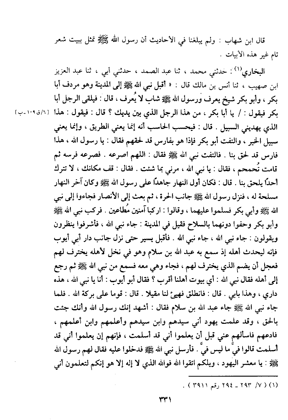 البُخَارِيّ: حَدثنِي مُحَمَّد، ثَنَا عبد الصَّمد، حَدثنِي أبي، ثَنَا عبد الْعَزِيز ابْن صُهَيْب، ثَنَا أنس بن مَالك قَالَ: " أقبل نَبِي الله - صَلَّى اللَّهُ عَلَيْهِ وَسَلَّم َ - إِلَى الْمَدِينَة وَهُوَ مردف أَبَا بكر، وَأَبُو بكر شيخ يعرف وَرَسُول الله - صَلَّى اللَّهُ عَلَيْهِ وَسَلَّم َ - شَاب لَا يعرف، قَالَ: فَيلقى الرجل أَبَا بكر فَيَقُول: / يَا أَبَا بكر، من هَذَا الرجل الَّذِي بَين يَديك؟ قَالَ: فَيَقُول: هَذَا الَّذِي يهديني السَّبِيل. قَالَ فيحسب الحاسب أَنه إِنَّمَا يَعْنِي الطَّرِيق، وَإِنَّمَا يَعْنِي سَبِيل الْخَيْر، والتفت أَبُو بكر فَإِذا هُوَ بِفَارِس قد لحقهم فَقَالَ: يَا رَسُول الله، هَذَا فَارس قد لحق بِنَا. فَالْتَفت نَبِي الله - صَلَّى اللَّهُ عَلَيْهِ وَسَلَّم َ - فَقَالَ: اللَّهُمَّ اصرعه. فصرعه فرسه ثمَّ قَامَت تحمحم، فَقَالَ: يَا نَبِي الله، مرني بِمَا شِئْت. فَقَالَ: قف مَكَانك، لَا تتْرك أحدا يلْحق بِنَا. قَالَ: فَكَانَ أول النَّهَار جاهدا على رَسُول الله - صَلَّى اللَّهُ عَلَيْهِ وَسَلَّم َ - وَكَانَ آخر النَّهَار مسلحة لَهُ، فَنزل رَسُول الله - صَلَّى اللَّهُ عَلَيْهِ وَسَلَّم َ - جَانب الْحرَّة، ثمَّ بعث إِلَى الْأَنْصَار فَجَاءُوا إِلَى نَبِي الله - صَلَّى اللَّهُ عَلَيْهِ وَسَلَّم َ - وَأبي بكر فَسَلمُوا عَلَيْهِمَا، وَقَالُوا: اركبا آمِنين مطاعين. فَركب نَبِي الله - صَلَّى اللَّهُ عَلَيْهِ وَسَلَّم َ - وَأَبُو بكر وحفوا دونهمَا بِالسِّلَاحِ فَقيل فِي الْمَدِينَة: جَاءَ نَبِي الله، فأشرفوا ينظرُونَ وَيَقُولُونَ: جَاءَ نَبِي الله، جَاءَ نَبِي الله. فَأقبل يسير حَتَّى نزل جَانب دَار أبي أَيُّوب فَإِنَّهُ ليحدث أَهله إِذْ سمع بِهِ عبد الله بن سَلام وَهُوَ فِي نخل لأَهله يخْتَرف لَهُم فَعجل أَن يضم الَّذِي يخْتَرف لَهُم، فجَاء وَهِي مَعَه فَسمع من نَبِي الله - صَلَّى اللَّهُ عَلَيْهِ وَسَلَّم َ - ثمَّ رَجَعَ إِلَى أَهله فَقَالَ نَبِي الله: أَي بيُوت أهلنا أقرب؟ فَقَالَ أَبُو أَيُّوب: أَنا يَا نَبِي الله، هَذِه دَاري، وَهَذَا بَابي. قَالَ: فَانْطَلق فهيئ لنا مقيلا. قَالَ: قوما على بركَة الله. فَلَمَّا جَاءَ نَبِي الله - صَلَّى اللَّهُ عَلَيْهِ وَسَلَّم َ - جَاءَ عبد الله بن سَلام فَقَالَ: أشهد إِنَّك رَسُول الله وَأَنَّك جِئْت بِالْحَقِّ، وَقد علمت يهود أَنِّي سيدهم وَابْن سيدهم وأعلمهم وَابْن أعلمهم، فادعهم فاسألهم عني قبل أَن يعلمُوا أَنِّي قد أسلمت، فَإِنَّهُم إِن يعلمُوا أَنِّي قد أسلمت قَالُوا فيّ مَا لَيْسَ فيّ. فَأرْسل نَبِي الله - صَلَّى اللَّهُ عَلَيْهِ وَسَلَّم َ - فَدَخَلُوا عَلَيْهِ فَقَالَ لَهُم رَسُول الله - صَلَّى اللَّهُ عَلَيْهِ وَسَلَّم َ -: يَا معشر الْيَهُود، وَيْلكُمْ اتَّقوا الله فوَاللَّه الَّذِي لَا إِلَه إِلَّا هُوَ إِنَّكُم لتعلمون أَنِّي