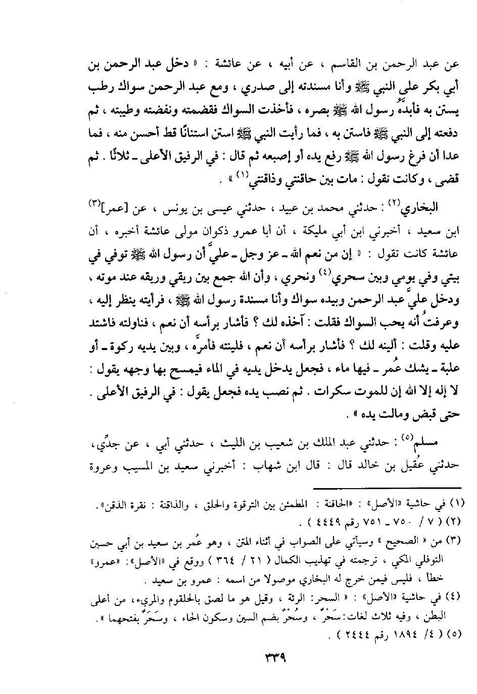 البُخَارِيّ: حَدثنِي مُحَمَّد بن عبيد، حَدثنِي عِيسَى بن يُونُس، عَن [عمر] ابْن سعيد، أَخْبرنِي ابْن أبي مليكَة، أَن أَبَا عَمْرو ذكْوَان مولى عَائِشَة أخبرهُ، أَن عَائِشَة كَانَت تَقول: " إِن من نعم الله - عز وَجل - عليّ أَن رَسُول الله - صَلَّى اللَّهُ عَلَيْهِ وَسَلَّم َ - توفّي فِي بَيْتِي وَفِي يومي وَبَين سحرِي وَنَحْرِي، وَأَن الله جمع بَين ريقي وريقه عِنْد مَوته، وَدخل عَليّ عبد الرَّحْمَن وَبِيَدِهِ سواك وَأَنا مُسندَة رَسُول الله - صَلَّى اللَّهُ عَلَيْهِ وَسَلَّم َ -، فرأيته ينظر إِلَيْهِ، وَعرفت أَنه يحب السِّوَاك فَقلت: آخذه لَك؟ فَأَشَارَ بِرَأْسِهِ أَن نعم، فناولته فَاشْتَدَّ عَلَيْهِ وَقلت: ألينه لَك؟ فَأَشَارَ بِرَأْسِهِ أَن نعم، فلينته فَأمره، وَبَين يَدَيْهِ ركوة - أَو علبة - يشك عمر - فِيهَا مَاء، فَجعل يدْخل يَدَيْهِ فِي المَاء فيمسح بهَا وَجهه يَقُول: لَا إِلَه إِلَّا الله إِن للْمَوْت سَكَرَات. ثمَّ نصب يَده فَجعل يَقُول فِي الرفيق الْأَعْلَى. حَتَّى قبض ومالت يَده ".