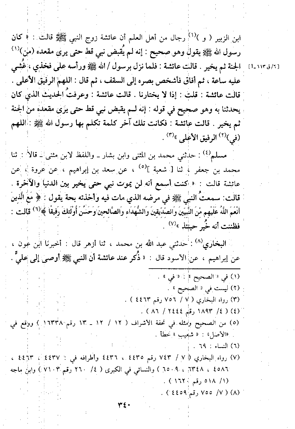 مُسلم: حَدثنِي مُحَمَّد بن الْمثنى وَابْن بشار - وَاللَّفْظ لِابْنِ مثنى - قَالَا: ثَنَا مُحَمَّد بن جَعْفَر: ثَنَا [شُعْبَة] ، عَن سعد بن إِبْرَاهِيم، عَن عُرْوَة، عَن عَائِشَة قَالَت: " كنت أسمع أَنه لن يَمُوت نَبِي حَتَّى يُخَيّر بَين الدُّنْيَا وَالْآخِرَة. قَالَت: سَمِعت النَّبِي - صَلَّى اللَّهُ عَلَيْهِ وَسَلَّم َ - فِي مَرضه الَّذِي مَاتَ فِيهِ وأخذته بحة يَقُول: {مَعَ الَّذين أنعم الله عَلَيْهِم من النَّبِيين وَالصديقين وَالشُّهَدَاء وَالصَّالِحِينَ وَحسن أُولَئِكَ رَفِيقًا} قَالَت: فَظَنَنْت أَنه خير حِينَئِذٍ ".