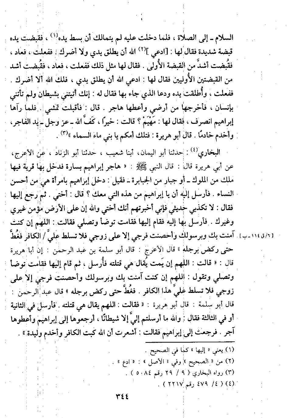 البُخَارِيّ: حَدثنَا أَبُو الْيَمَان، أبنا شُعَيْب، حَدثنَا أَبُو الزِّنَاد، عَن الْأَعْرَج، عَن أبي هُرَيْرَة قَالَ: قَالَ النَّبِي - صَلَّى اللَّهُ عَلَيْهِ وَسَلَّم َ -: " هَاجر إِبْرَاهِيم بسارة فَدخل بهَا قَرْيَة فِيهَا ملك من الْمُلُوك - أَو جَبَّار من الْجَبَابِرَة - فَقيل: دخل إِبْرَاهِيم بِامْرَأَة هِيَ من أحسن النِّسَاء. فَأرْسل إِلَيْهِ أَن يَا إِبْرَاهِيم من هَذِه الَّتِي مَعَك؟ قَالَ: أُخْتِي. ثمَّ رَجَعَ إِلَيْهَا فَقَالَ: لَا تكذبي حَدِيثي فَإِنِّي أَخْبَرتهم أَنَّك أُخْتِي وَالله إِن على الأَرْض مُؤمن غَيْرِي وَغَيْرك. فَأرْسل بهَا إِلَيْهِ فَقَامَ إِلَيْهَا فَقَامَتْ تَوَضَّأ وَتصلي فَقَالَت: اللَّهُمَّ إِن كنت آمَنت بك وبرسولك وأحصنت فَرجي إِلَى على زَوجي فَلَا تسلط عَليّ / الْكَافِر فغط حَتَّى ركض بِرجلِهِ " قَالَ الْأَعْرَج: قَالَ أَبُو سَلمَة بن عبد الرَّحْمَن: إِن أَبَا هُرَيْرَة قَالَ: " قَالَت: اللَّهُمَّ إِن يمت يُقَال هِيَ قتلته فَأرْسل، ثمَّ قَامَ إِلَيْهَا فَقَامَتْ تَوَضَّأ وَتصلي وَتقول: اللَّهُمَّ إِن كنت آمَنت بك وبرسولك وأحصنت فَرجي إِلَّا على زَوجي فَلَا تسلط عَليّ هَذَا الْكَافِر. فغط حَتَّى ركض بِرجلِهِ " قَالَ عبد الرَّحْمَن: قَالَ أَبُو سَلمَة: قَالَ أَبُو هُرَيْرَة: " فَقَالَت: اللَّهُمَّ يُقَال هِيَ قتلته. فَأرْسل فِي الثَّانِيَة أَو فِي الثَّالِثَة فَقَالَ: وَالله مَا أرسلتم إِلَيّ إِلَّا شَيْطَانا، أرجعوها إِلَى إِبْرَاهِيم وأعطوها آجر. فَرَجَعت إِلَى إِبْرَاهِيم فَقَالَت: أشعرت أَن الله كبت الْكَافِر وَأَخْدَم وليدة ".