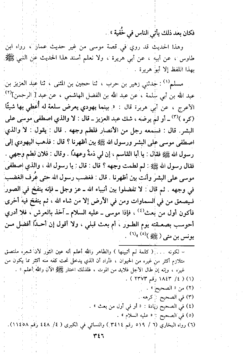 مُسلم: حَدثنِي زُهَيْر بن حَرْب، ثَنَا حجين بن الْمثنى، ثَنَا عبد الْعَزِيز بن عبد الله بن أبي سَلمَة، عَن عبد الله بن الْفضل الْهَاشِمِي، عَن عبد [الرَّحْمَن] الْأَعْرَج، عَن أبي هُرَيْرَة قَالَ: " بَيْنَمَا يَهُودِيّ يعرض سلْعَة لَهُ أعطي بهَا شَيْئا (كره) - أَو لم يرضه، شكّ عبد الْعَزِيز - قَالَ: لَا وَالَّذِي اصْطفى مُوسَى على الْبشر. قَالَ: فَسَمعهُ رجل من الْأَنْصَار فلطم وَجهه. قَالَ: يَقُول: لَا وَالَّذِي اصْطفى مُوسَى على الْبشر وَرَسُول الله - صَلَّى اللَّهُ عَلَيْهِ وَسَلَّم َ - بَين أظهرنَا؟ قَالَ: فَذهب الْيَهُودِيّ إِلَى رَسُول الله - صَلَّى اللَّهُ عَلَيْهِ وَسَلَّم َ - فَقَالَ: يَا أَبَا الْقَاسِم، إِن لي ذمَّة وعهدا. وَقَالَ فلَان لطم وَجْهي. فَقَالَ رَسُول الله - صَلَّى اللَّهُ عَلَيْهِ وَسَلَّم َ -: لم لطمت وَجهه؟ قَالَ: قَالَ: يَا رَسُول الله، وَالَّذِي اصْطفى مُوسَى على الْبشر وَأَنت بَين أظهرنَا. قَالَ: فَغَضب رَسُول الله حَتَّى عرف الْغَضَب فِي وَجهه. ثمَّ قَالَ: لَا تفضلوا بَين أَنْبيَاء الله - عز وَجل - فَإِنَّهُ ينْفخ فِي الصُّور فيصعق من فِي السَّمَاوَات وَمن فِي الأَرْض إِلَّا من شَاءَ الله، ثمَّ ينْفخ فِيهِ أُخْرَى فَأَكُون أول من بعث، فَإِذا مُوسَى - عَلَيْهِ السَّلَام - آخذ بالعرش، فَلَا أَدْرِي أحوسب بصعقته يَوْم الطّور، أم بعث قبلي، وَلَا أَقُول إِن أحدا أفضل من يُونُس بن مَتى (- صَلَّى اللَّهُ عَلَيْهِ وَسَلَّم َ -) ".