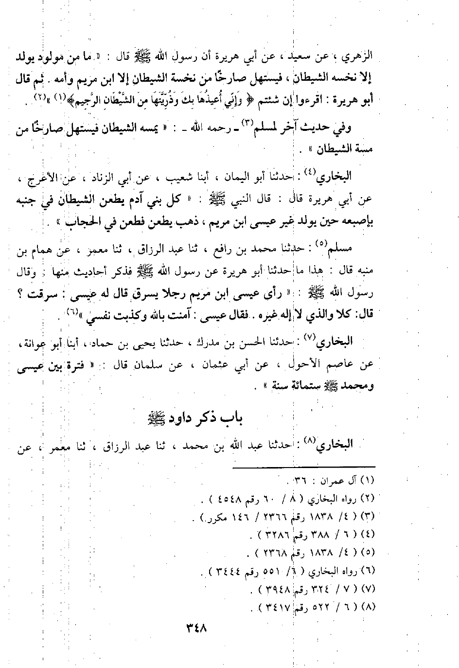 البُخَارِيّ: حَدثنَا أَبُو الْيَمَان، أبنا شُعَيْب، عَن أبي الزِّنَاد، عَن الْأَعْرَج، عَن أبي هُرَيْرَة قَالَ: قَالَ النَّبِي - صَلَّى اللَّهُ عَلَيْهِ وَسَلَّم َ -: " كل بني آدم يطعن الشَّيْطَان فِي جنبه بإصبعه حِين يُولد غير عِيسَى ابْن مَرْيَم، ذهب يطعن فطعن فِي الْحجاب ".