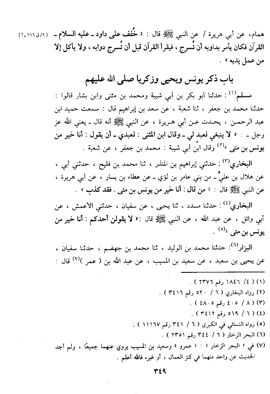 البُخَارِيّ: حَدثنَا مُسَدّد، ثَنَا يحيى، عَن سُفْيَان، حَدثنِي الْأَعْمَش، عَن أبي وَائِل، عَن عبد الله، عَن النَّبِي - صَلَّى اللَّهُ عَلَيْهِ وَسَلَّم َ - قَالَ: " لَا يَقُولَن أحدكُم: أَنا خير من يُونُس بن مَتى ".
