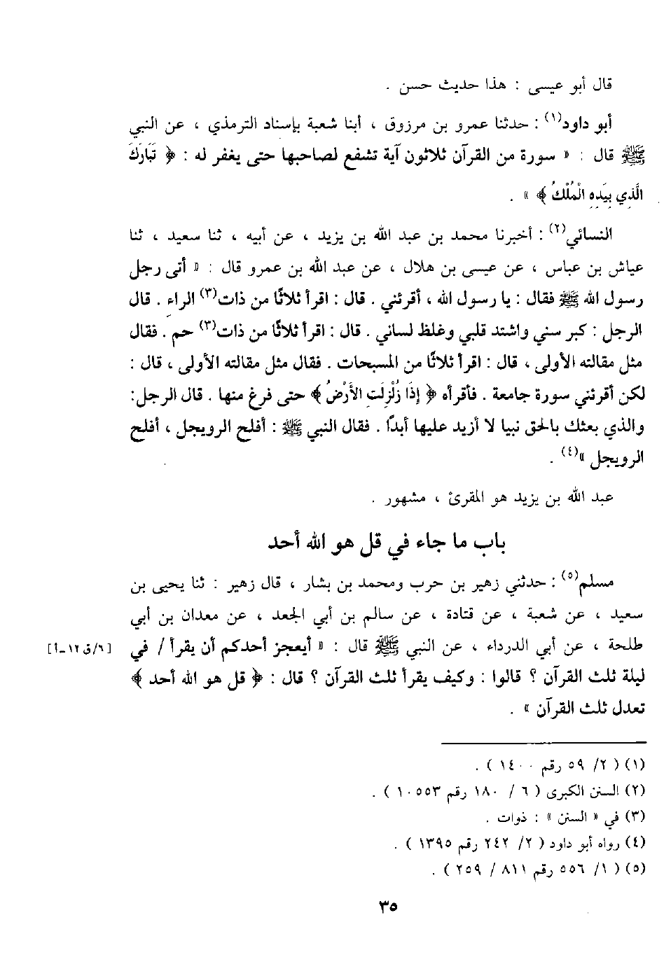 مُسلم: حَدثنِي زُهَيْر بن حَرْب وَمُحَمّد بن بشار، قَالَ زُهَيْر: ثَنَا يحيى بن سعيد، عَن شُعْبَة، عَن قَتَادَة، عَن سَالم بن أبي الْجَعْد، عَن معدان بن أبي طَلْحَة، عَن أبي الدَّرْدَاء، عَن النَّبِي - صَلَّى اللَّهُ عَلَيْهِ وَسَلَّم َ - قَالَ: " أَيعْجزُ أحدكُم أَن يقْرَأ / فِي لَيْلَة ثلث الْقُرْآن؟ قَالُوا: وَكَيف يقْرَأ ثلث الْقُرْآن؟ قَالَ: {قل هُوَ الله أحد} تعدل ثلث الْقُرْآن ".