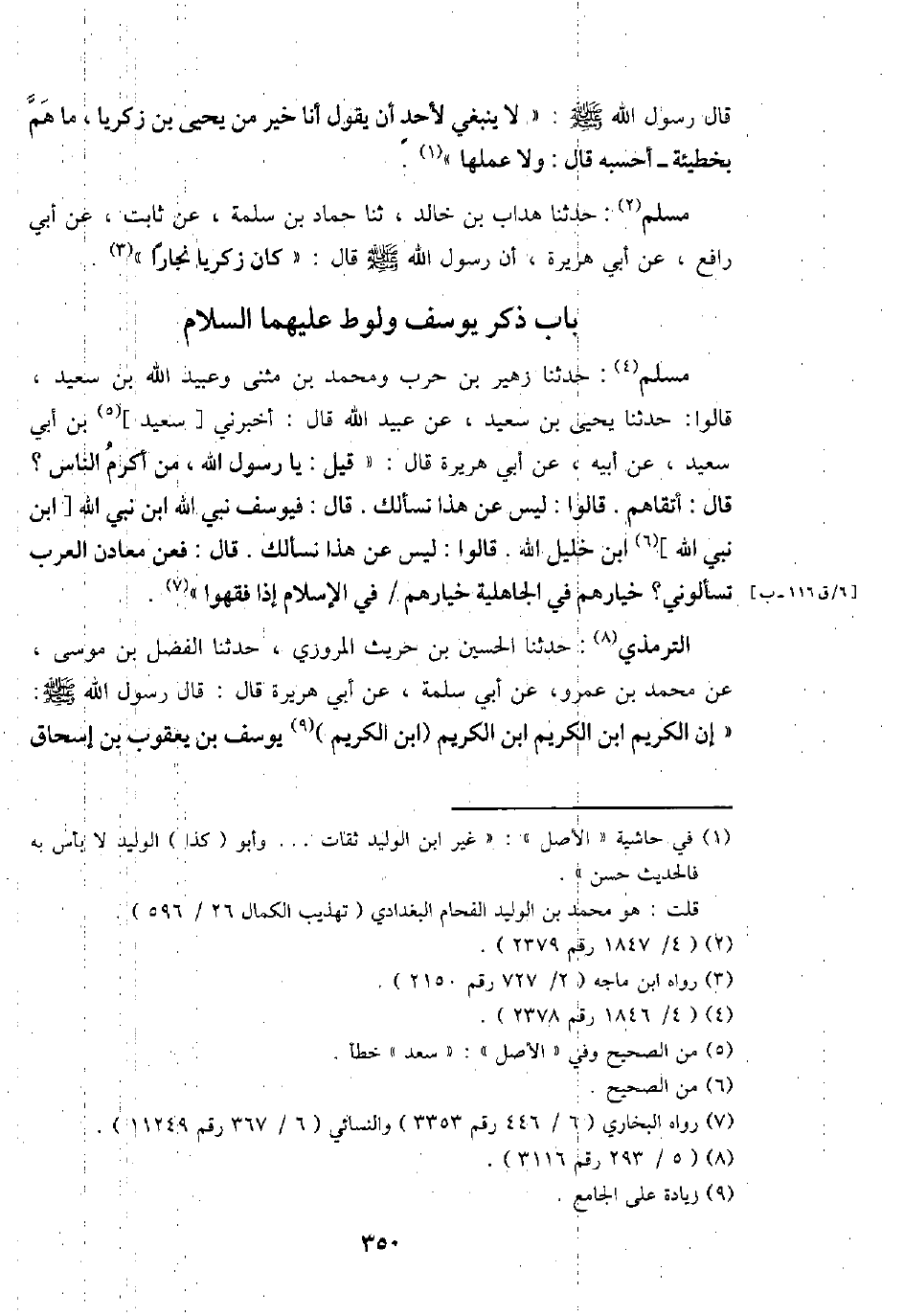 التِّرْمِذِيّ: حَدثنَا الْحُسَيْن بن حُرَيْث الْمروزِي، حَدثنَا الْفضل بن مُوسَى، عَن مُحَمَّد بن عَمْرو، عَن أبي سَلمَة، عَن أبي هُرَيْرَة قَالَ: قَالَ رَسُول الله - صَلَّى اللَّهُ عَلَيْهِ وَسَلَّم َ -: " إِن الْكَرِيم ابْن الْكَرِيم ابْن الْكَرِيم (ابْن الْكَرِيم) يُوسُف بن يَعْقُوب بن إِسْحَاق