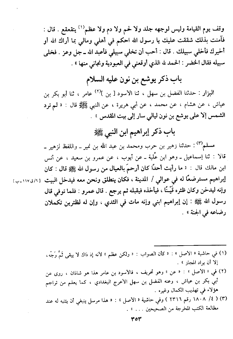 مُسلم: حَدثنَا زُهَيْر بن حَرْب وَمُحَمّد بن عبد الله بن نمير - وَاللَّفْظ لزهير - قَالَا: ثَنَا إِسْمَاعِيل - وَهُوَ ابْن علية - عَن أَيُّوب، عَن عَمْرو بن سعيد، عَن أنس ابْن مَالك قَالَ: مَا رَأَيْت أحدا كَانَ أرْحم بالعيال من رَسُول الله - صَلَّى اللَّهُ عَلَيْهِ وَسَلَّم َ - قَالَ: كَانَ إِبْرَاهِيم مسترضعا لَهُ فِي عوالي / الْمَدِينَة، فَكَانَ ينْطَلق وَنحن مَعَه فَيدْخل الْبَيْت وَإنَّهُ ليدخن وَكَانَ ظئره قينا، فَيَأْخذهُ فيقبله ثمَّ يرجع. قَالَ عَمْرو: فَلَمَّا توفّي قَالَ رَسُول الله - صَلَّى اللَّهُ عَلَيْهِ وَسَلَّم َ -: إِن إِبْرَاهِيم ابْني وَإنَّهُ مَاتَ فِي الثدي، وَإِن لَهُ لظئرين تكملان رضاعه فِي الْجنَّة ".