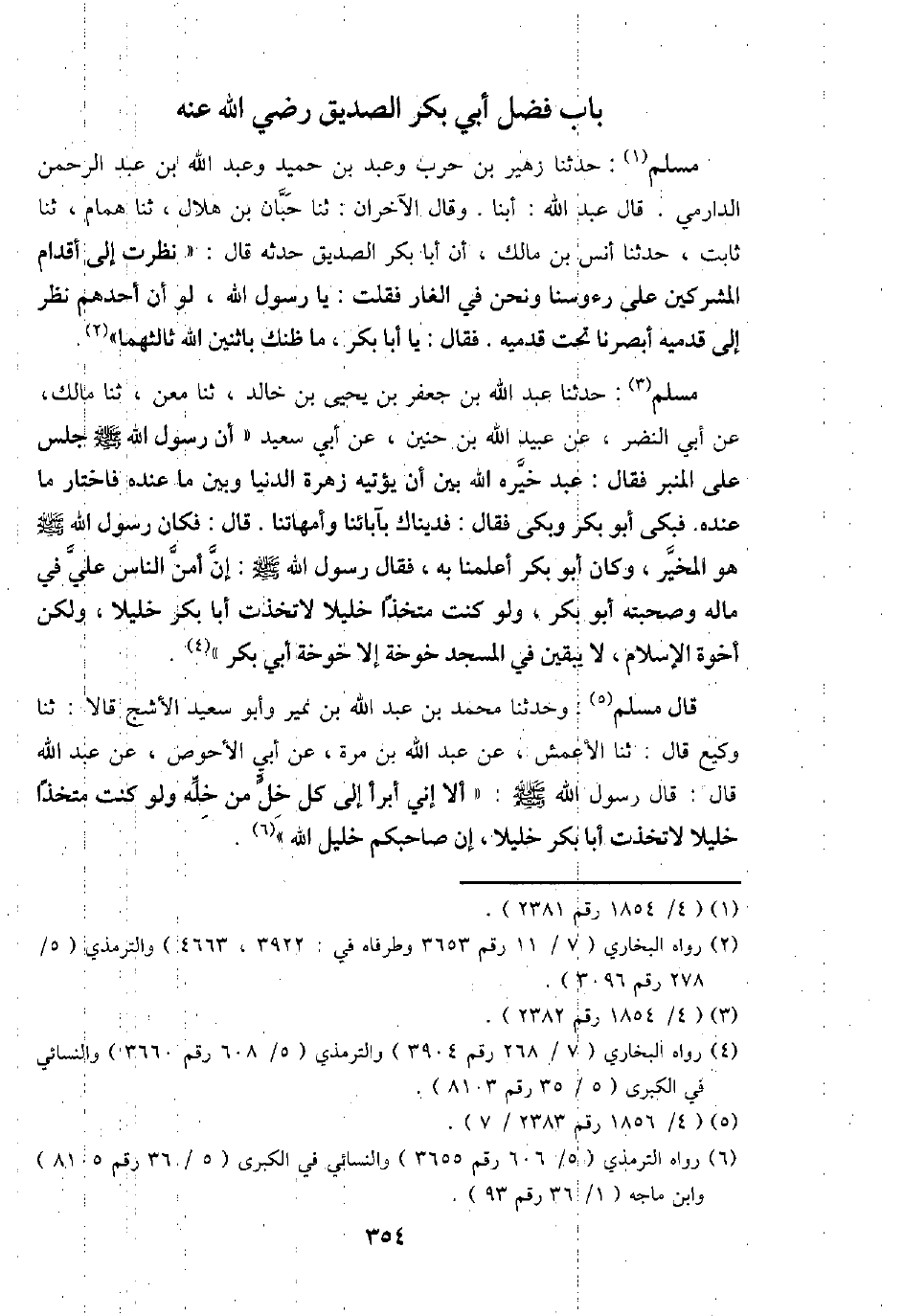 مُسلم: حَدثنَا عبد الله بن جَعْفَر بن يحيى بن خَالِد، ثَنَا معن، ثَنَا مَالك، عَن أبي النَّضر، عَن عبيد الله بن حنين، عَن أبي سعيد " أَن رَسُول الله - صَلَّى اللَّهُ عَلَيْهِ وَسَلَّم َ - جلس على الْمِنْبَر فَقَالَ: عبد خَيره الله بَين أَن يؤتيه زهرَة الدُّنْيَا وَبَين مَا عِنْده فَاخْتَارَ مَا عِنْده. فَبكى أَبُو بكر وَبكى فَقَالَ: فَدَيْنَاك بِآبَائِنَا وَأُمَّهَاتنَا. قَالَ: فَكَانَ رَسُول الله - صَلَّى اللَّهُ عَلَيْهِ وَسَلَّم َ - هُوَ الْمُخَير، وَكَانَ أَبُو بكر أعلمنَا بِهِ، فَقَالَ رَسُول الله - صَلَّى اللَّهُ عَلَيْهِ وَسَلَّم َ -: إِن أَمن النَّاس عَليّ فِي مَاله وصحبته أَبُو بكر، وَلَو كنت متخذا خَلِيلًا لاتخذت أَبَا بكر خَلِيلًا، وَلَكِن أخوة الْإِسْلَام، لَا يبْقين فِي الْمَسْجِد خوخة إِلَّا خوخة أبي بكر ".