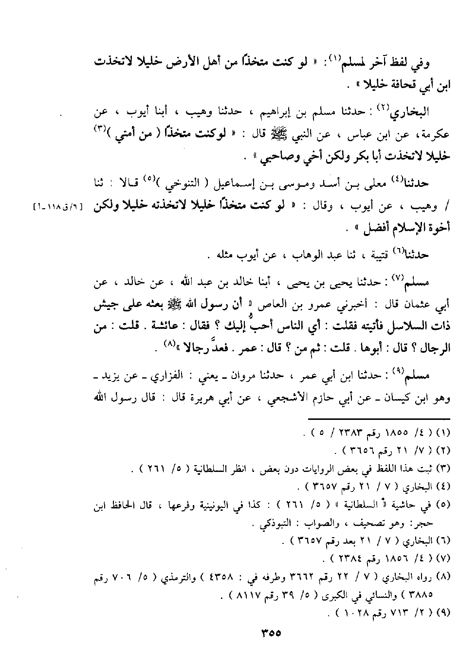 مُسلم: حَدثنَا يحيى بن يحيى، أبنا خَالِد بن عبد الله، عَن خَالِد، عَن أبي عُثْمَان قَالَ: أَخْبرنِي عَمْرو بن الْعَاصِ " أَن رَسُول الله - صَلَّى اللَّهُ عَلَيْهِ وَسَلَّم َ - بَعثه على جَيش ذَات السلَاسِل فَأَتَيْته فَقلت: أَي النَّاس أحب إِلَيْك؟ فَقَالَ: عَائِشَة. قلت: من الرِّجَال؟ قَالَ: أَبوهَا. قلت: ثمَّ من؟ قَالَ: عمر. فعد رجَالًا ".