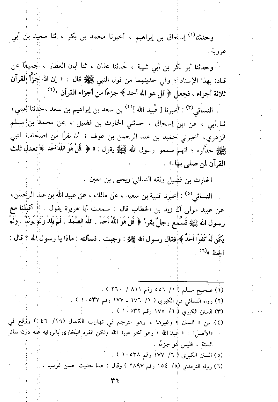 النَّسَائِيّ: أخبرنَا [عبيد الله] بن سعد بن إِبْرَاهِيم بن سعد، حَدثنَا عمي، ثَنَا أبي، عَن ابْن إِسْحَاق، حَدثنِي الْحَارِث بن فُضَيْل، عَن مُحَمَّد بن مُسلم الزُّهْرِيّ، أَخْبرنِي حميد بن عبد الرَّحْمَن بن عَوْف؛ أَن نَفرا من أَصْحَاب النَّبِي - صَلَّى اللَّهُ عَلَيْهِ وَسَلَّم َ - حدثوه؛ أَنهم سمعُوا رَسُول الله - صَلَّى اللَّهُ عَلَيْهِ وَسَلَّم َ - يَقُول: " {قل هُوَ الله أحد} تعدل ثلث الْقُرْآن لمن صلى بهَا ".