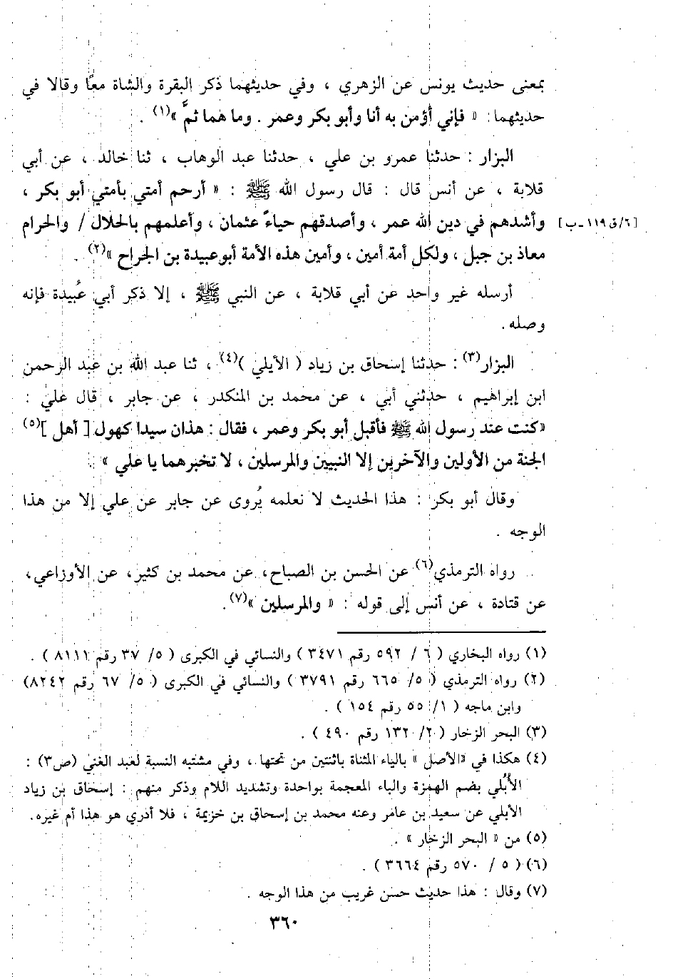 الْبَزَّار: حَدثنَا عَمْرو بن عَليّ، حَدثنَا عبد الْوَهَّاب، ثَنَا خَالِد، عَن أبي قلَابَة، عَن أنس قَالَ: قَالَ رَسُول الله - صَلَّى اللَّهُ عَلَيْهِ وَسَلَّم َ -: " أرْحم أمتِي بأمتي أَبُو بكر، وأشدهم فِي دين الله عمر، وأصدقهم حَيَاء عُثْمَان، وأعلمهم بالحلال / وَالْحرَام معَاذ بن جبل، وَلكُل أمة أَمِين، وَأمين هَذِه الْأمة أَبُو عُبَيْدَة بن الْجراح ".