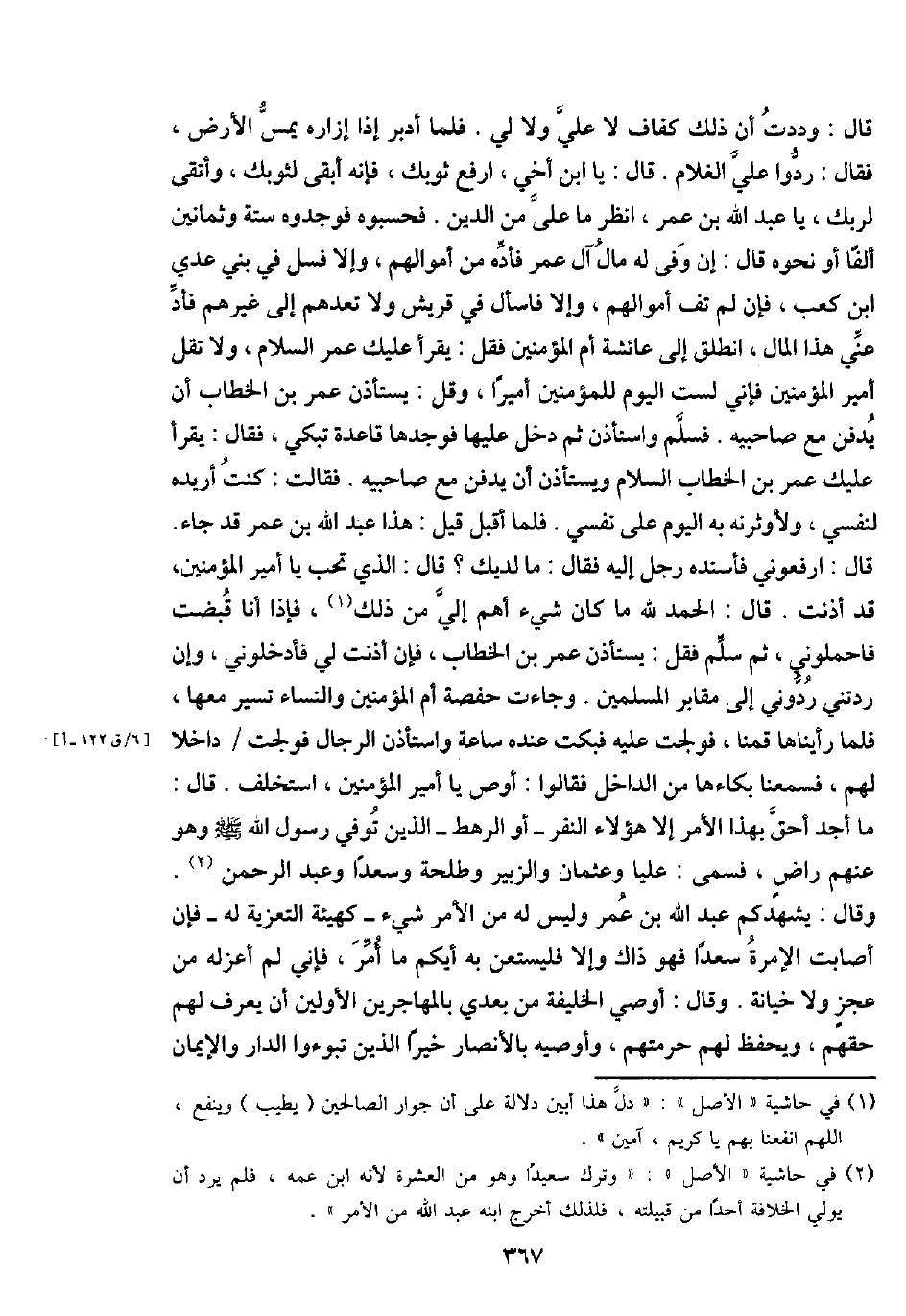 قَالَ: وددت أَن ذَلِك كفاف لَا عَليّ وَلَا لي. فَلَمَّا أدبر إِذا إزَاره يمس الأَرْض، فَقَالَ: ردوا عَليّ الْغُلَام. قَالَ: يَا ابْن أخي، ارْفَعْ ثَوْبك، فَإِنَّهُ أبقى لثوبك، وَأتقى لِرَبِّك، يَا عبد الله بن عمر، انْظُر مَا عَليّ من الدَّين. فحسبوه فوجدوه سِتَّة وَثَمَانِينَ ألفا أَو نَحوه قَالَ: إِن وفى لَهُ مَال آل عمر فأده من أَمْوَالهم، وَإِلَّا فسل فِي بني عدي ابْن كَعْب، فَإِن لم تف أَمْوَالهم، وَإِلَّا فاسأل فِي قُرَيْش وَلَا تعدهم إِلَى غَيرهم فأد عني هَذَا المَال، انْطلق إِلَى عَائِشَة أم الْمُؤمنِينَ فَقل: يقْرَأ عَلَيْك عمر السَّلَام، وَلَا تقل أَمِير الْمُؤمنِينَ فَإِنِّي لست الْيَوْم للْمُؤْمِنين أَمِيرا، وَقل يسْتَأْذن عمر بن الْخطاب أَن يدْفن مَعَ صَاحِبيهِ. فَسلم وَاسْتَأْذَنَ ثمَّ دخل عَلَيْهَا فَوَجَدَهَا قَاعِدَة تبْكي، فَقَالَ: يقْرَأ عَلَيْك عمر بن الْخطاب السَّلَام ويستأذن أَن يدْفن مَعَ صَاحِبيهِ. فَقَالَت: كنت أريده لنَفْسي، ولأوثرنه بِهِ الْيَوْم على نَفسِي. فَلَمَّا أقبل قيل: هَذَا عبد الله بن عمر قد جَاءَ. قَالَ: ارفعوني فأسنده رجل إِلَيْهِ فَقَالَ: مَا لديك؟ قَالَ: الَّذِي تحب يَا أَمِير الْمُؤمنِينَ، قد أَذِنت. قَالَ الْحَمد لله مَا كَانَ شَيْء أهم إِلَيّ من ذَلِك، فَإِذا أَنا قبضت فاحملوني، ثمَّ سلم فَقل: يسْتَأْذن عمر بن الْخطاب، فَإِن أَذِنت لي فأدخلوني، وَإِن ردتني ردوني إِلَى مَقَابِر الْمُسلمين. وَجَاءَت حَفْصَة أم الْمُؤمنِينَ وَالنِّسَاء تسير مَعهَا، فَلَمَّا رأيناها قمنا، فولجت عَلَيْهِ فَبَكَتْ عِنْده سَاعَة وَاسْتَأْذَنَ الرِّجَال فولجت / دَاخِلا لَهُم، فسمعنا بكاءها من الدَّاخِل فَقَالُوا: أوص يَا أَمِير الْمُؤمنِينَ، اسْتخْلف. قَالَ: مَا أجد أَحَق بِهَذَا الْأَمر إِلَّا هَؤُلَاءِ النَّفر - أَو الرَّهْط - الَّذين توفّي رَسُول الله - صَلَّى اللَّهُ عَلَيْهِ وَسَلَّم َ - وَهُوَ عَنْهُم رَاض، فَسمى: عليا وَعُثْمَان وَالزُّبَيْر وَطَلْحَة وسعدا وَعبد الرَّحْمَن. وَقَالَ: يشهدكم عبد الله بن عمر وَلَيْسَ لَهُ من الْأَمر شَيْء - كَهَيئَةِ التَّعْزِيَة لَهُ - فَإِن أَصَابَت الإمرة سَعْدا فَهُوَ ذَاك وَإِلَّا فليستعلن بِهِ أَيّكُم مَا أَمر، فَإِنِّي لم أعزله من عجز وَلَا خِيَانَة، وَقَالَ: أوصِي الْخَلِيفَة من بعدِي بالمهاجرين الْأَوَّلين أَن يعرف لَهُم حَقهم، ويحفظ عَلَيْهِم حرمتهم، وأوصيه بالأنصار خيرا الَّذين تبوءوا الدَّار وَالْإِيمَان