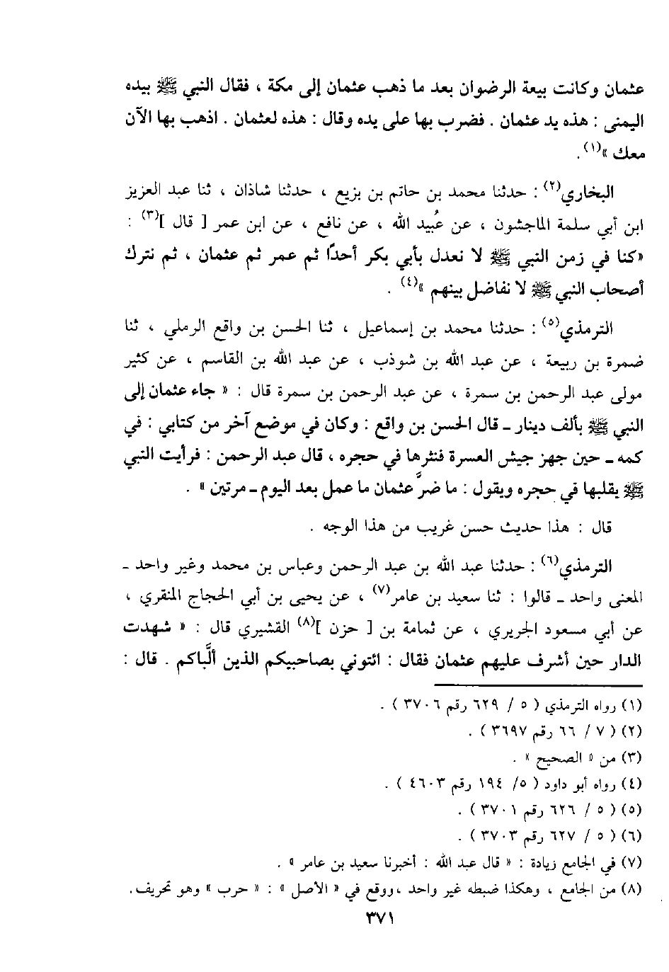 التِّرْمِذِيّ: حَدثنَا عبد الله بن عبد الرَّحْمَن وعباس بن مُحَمَّد وَغير وَاحِد - الْمَعْنى وَاحِد - قَالُوا: ثَنَا سعيد بن عَامر، عَن يحيى بن أبي الْحجَّاج الْمنْقري، عَن أبي مَسْعُود الْجريرِي، عَن ثُمَامَة بن [حزن] الْقشيرِي قَالَ: " شهِدت الدَّار حِين أشرف عَلَيْهِم عُثْمَان فَقَالَ: ائْتُونِي بصاحبيكم الَّذين ألباكم. قَالَ: