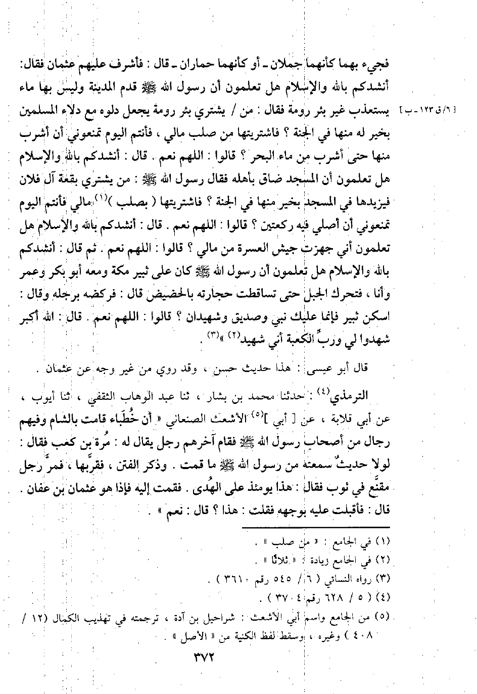 التِّرْمِذِيّ: حَدثنَا مُحَمَّد بن بشار، ثَنَا عبد الْوَهَّاب الثَّقَفِيّ، ثَنَا أَيُّوب، عَن أبي قلَابَة، عَن [أبي] الْأَشْعَث الصَّنْعَانِيّ " أَن خطباء قَامَت بِالشَّام وَفِيهِمْ رجال من أَصْحَاب رَسُول الله - صَلَّى اللَّهُ عَلَيْهِ وَسَلَّم َ - فَقَامَ آخِرهم رجل يُقَال لَهُ: مرّة بن كَعْب فَقَالَ: لَوْلَا حَدِيث سمعته من رَسُول الله - صَلَّى اللَّهُ عَلَيْهِ وَسَلَّم َ - مَا قُمْت. وَذكر الْفِتَن، فقربها، فَمر رجل مقنع فِي ثوب فَقَالَ: هَذَا يَوْمئِذٍ على الْهدى. فَقُمْت إِلَيْهِ فَإِذا هُوَ عُثْمَان بن عَفَّان. قَالَ: فَأَقْبَلت عَلَيْهِ بِوَجْهِهِ فَقلت: هَذَا؟ قَالَ: نعم ".
