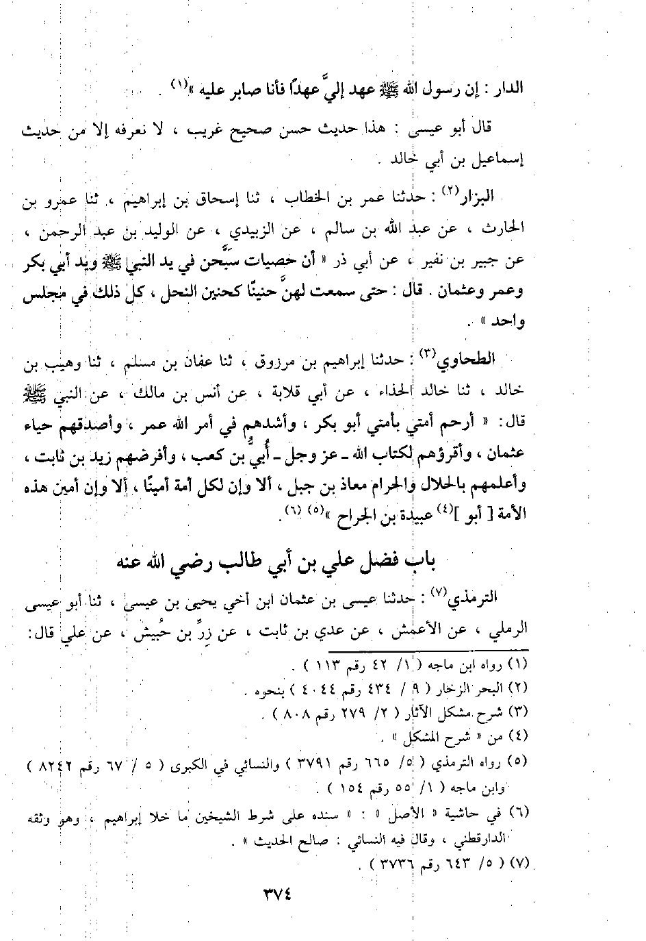 التِّرْمِذِيّ: حَدثنَا عِيسَى بن عُثْمَان ابْن أخي يحيى بن عِيسَى، ثَنَا أَبُو عِيسَى الرَّمْلِيّ، عَن الْأَعْمَش، عَن عدي بن ثَابت، عَن زر بن حُبَيْش، عَن عَليّ قَالَ: