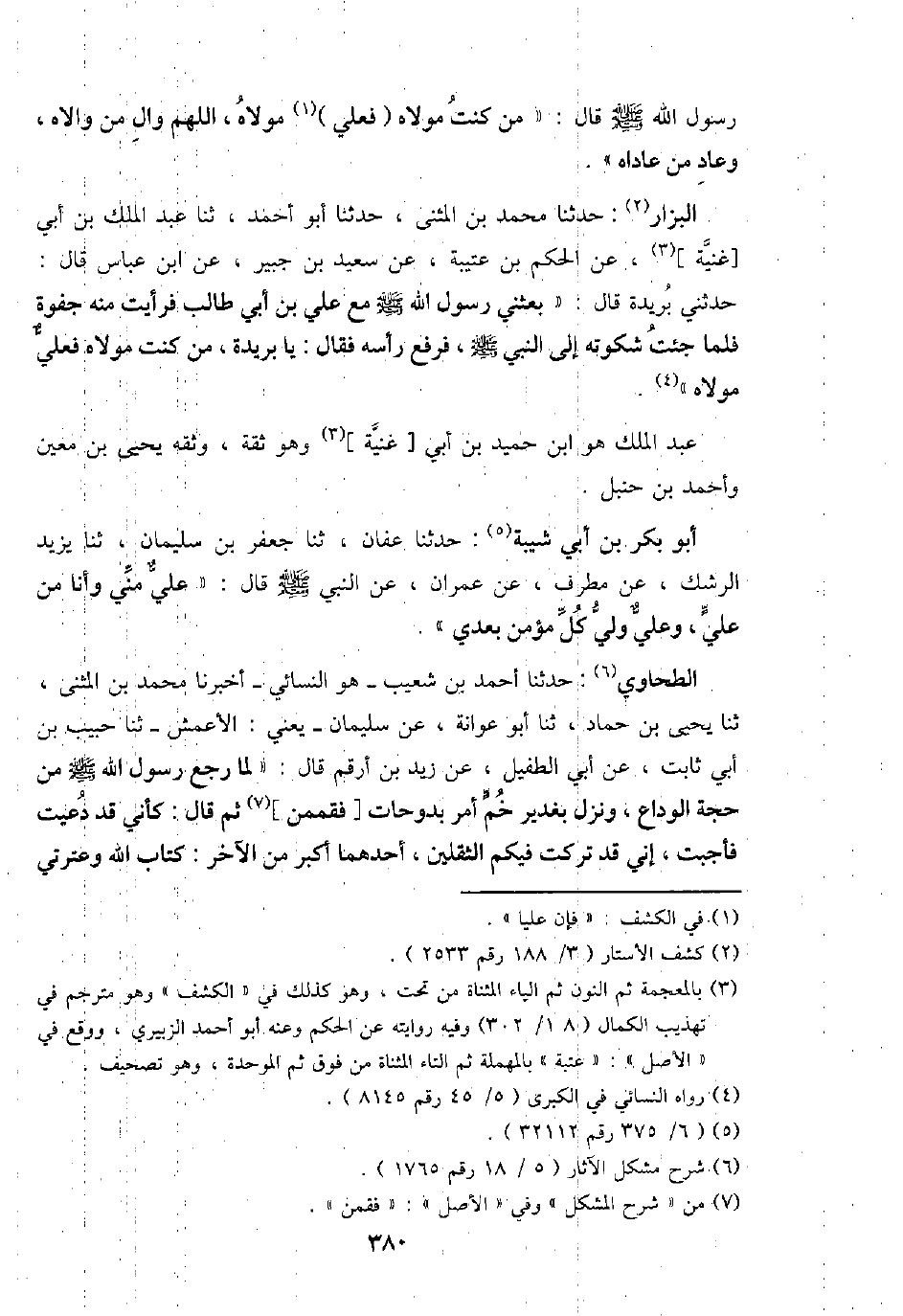 الطَّحَاوِيّ: حَدثنَا أَحْمد بن شُعَيْب - هُوَ النَّسَائِيّ - أخبرنَا مُحَمَّد بن الْمثنى، ثَنَا يحيى بن حَمَّاد، ثَنَا أَبُو عوَانَة، عَن سُلَيْمَان - يَعْنِي: الْأَعْمَش - ثَنَا حبيب بن أبي ثَابت، عَن أبي الطُّفَيْل، عَن زيد بن أَرقم قَالَ: " لما رَجَعَ رَسُول الله - صَلَّى اللَّهُ عَلَيْهِ وَسَلَّم َ - من حجَّة الْوَدَاع، وَنزل بغدير خم أَمر بدوحات [فقممن] ثمَّ قَالَ: كَأَنِّي قد دعيت فأجبت، إِنِّي قد تركت فِيكُم الثقلَيْن، أَحدهمَا أكبر من الآخر: كتاب الله وعترتي