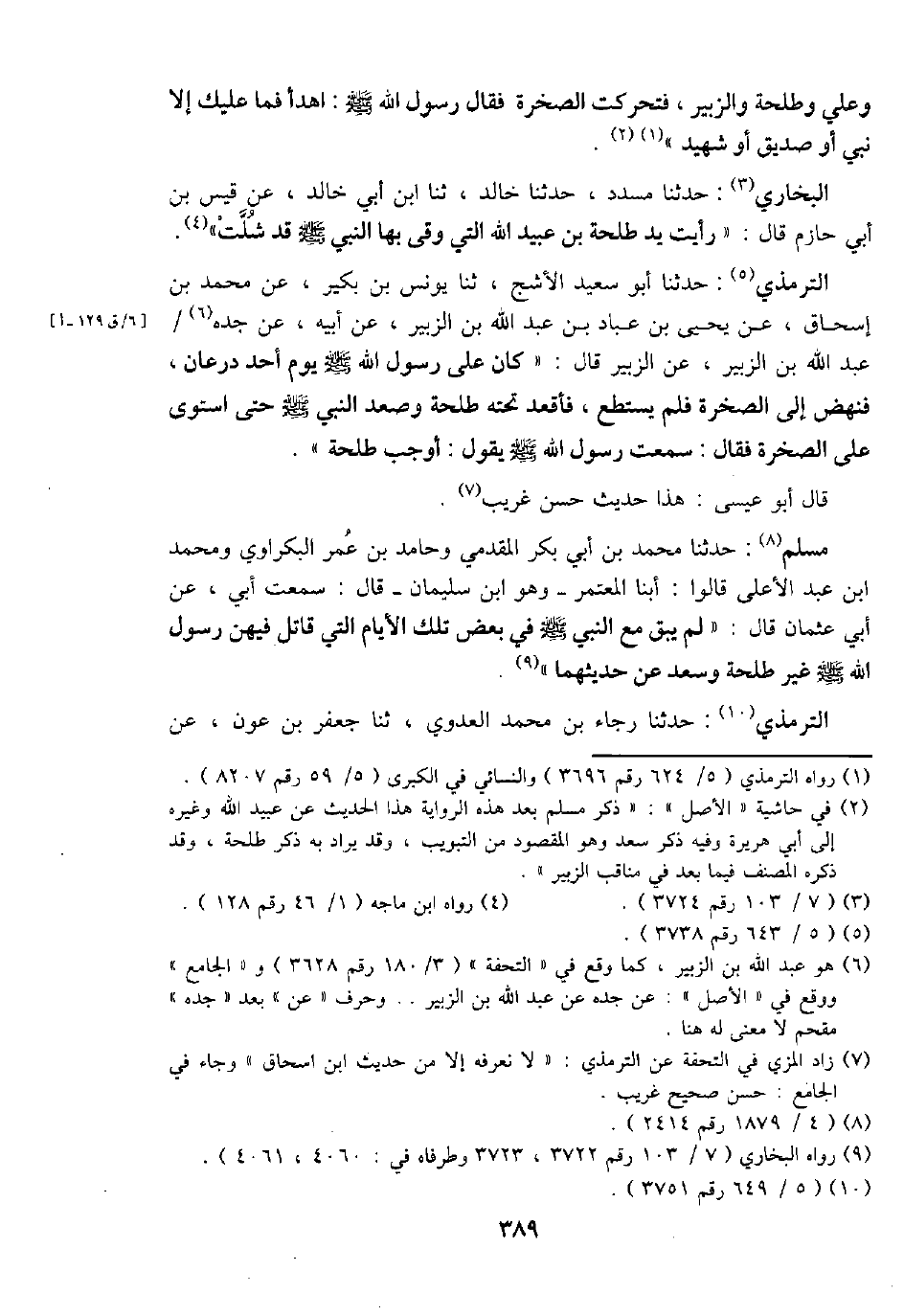 التِّرْمِذِيّ: حَدثنَا أَبُو سعيد الْأَشَج، ثَنَا يُونُس بن بكير، عَن مُحَمَّد بن إِسْحَاق، عَن يحيى بن عباد بن عبد الله بن الزبير، عَن أَبِيه، عَن جده / عبد الله بن الزبير، عَن الزبير قَالَ: " كَانَ على رَسُول الله - صَلَّى اللَّهُ عَلَيْهِ وَسَلَّم َ - يَوْم أحد دِرْعَانِ، فَنَهَضَ إِلَى الصَّخْرَة فَلم يسْتَطع، فَأقْعدَ تَحْتَهُ طَلْحَة وَصعد النَّبِي - صَلَّى اللَّهُ عَلَيْهِ وَسَلَّم َ - حَتَّى اسْتَوَى على الصَّخْرَة فَقَالَ: سَمِعت رَسُول الله - صَلَّى اللَّهُ عَلَيْهِ وَسَلَّم َ - يَقُول: أوجب طَلْحَة ".