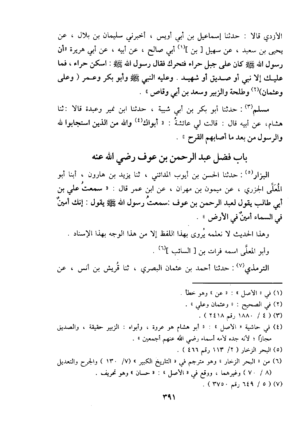 الْأَزْدِيّ قَالَا: حَدثنَا إِسْمَاعِيل بن أبي أويس، أَخْبرنِي سُلَيْمَان بن بِلَال، عَن يحيى بن سعيد، عَن سُهَيْل [بن] أبي صَالح، عَن أَبِيه، عَن أبي هُرَيْرَة " أَن رَسُول الله - صَلَّى اللَّهُ عَلَيْهِ وَسَلَّم َ - كَانَ على جبل حراء فَتحَرك فَقَالَ رَسُول الله - صَلَّى اللَّهُ عَلَيْهِ وَسَلَّم َ -: اسكن حراء، فَمَا عَلَيْك إِلَّا نَبِي أَو صديق أَو شَهِيد. وَعَلِيهِ النَّبِي - صَلَّى اللَّهُ عَلَيْهِ وَسَلَّم َ - وَأَبُو بكر وَعمر (وَعلي وَعُثْمَان) وَطَلْحَة وَالزُّبَيْر وَسعد بن أبي وَقاص ".