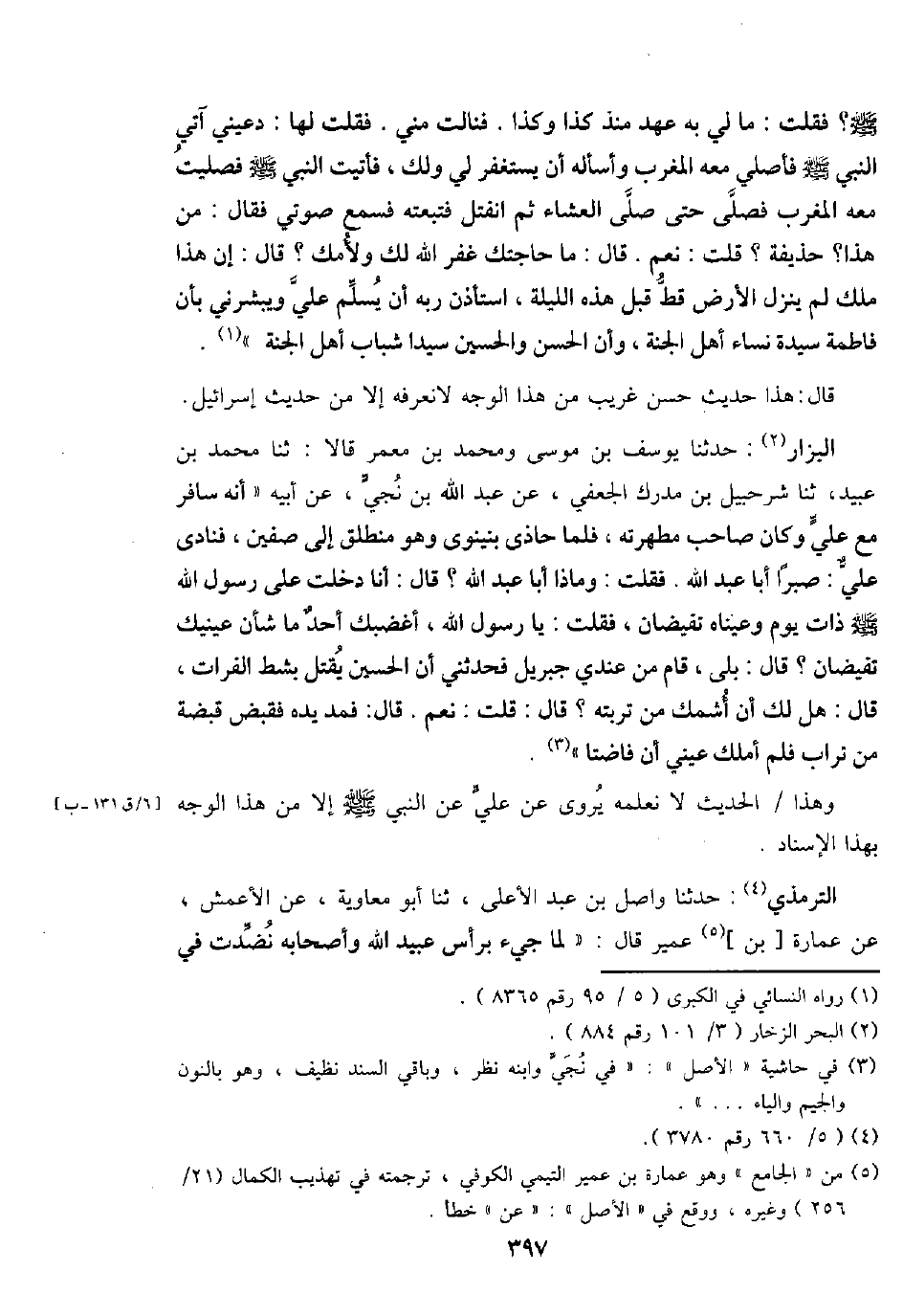 - صَلَّى اللَّهُ عَلَيْهِ وَسَلَّم َ -؟ فَقلت: مَا لي بِهِ عهد مُنْذُ كَذَا وَكَذَا. فنالت مني. فَقلت لَهَا: دعيني آتِي النَّبِي - صَلَّى اللَّهُ عَلَيْهِ وَسَلَّم َ - فأصلي مَعَه الْمغرب وأسأله أَن يسْتَغْفر لي وَلَك، فَأتيت النَّبِي - صَلَّى اللَّهُ عَلَيْهِ وَسَلَّم َ - فَصليت مَعَه الْمغرب فصلى حَتَّى صلى الْعشَاء ثمَّ انْفَتَلَ فتبعته فَسمع صوتي فَقَالَ: من هَذَا؟ حُذَيْفَة؟ قلت: نعم. قَالَ: مَا حَاجَتك غفر الله لَك ولأمك؟ قَالَ: إِن هَذَا ملك لم ينزل الأَرْض قطّ قبل هَذِه اللَّيْلَة، اسْتَأْذن ربه أَن يسلم عَليّ ويبشرني بِأَن فَاطِمَة سيدة نسَاء أهل الْجنَّة، وَأَن الْحسن وَالْحُسَيْن سيدا شباب أهل الْجنَّة ".
