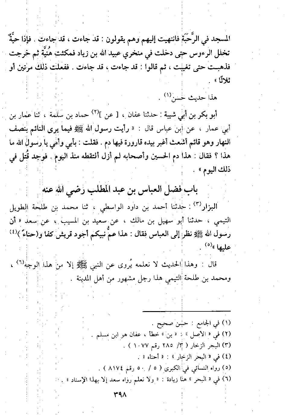 الْبَزَّار: حَدثنَا أَحْمد بن دَاوُد الوَاسِطِيّ، ثَنَا مُحَمَّد بن طَلْحَة الطَّوِيل التَّيْمِيّ، حَدثنَا أَبُو سهل بن مَالك، عَن سعيد بن الْمسيب، عَن سعد " أَن رَسُول الله - صَلَّى اللَّهُ عَلَيْهِ وَسَلَّم َ - نظر إِلَى الْعَبَّاس فَقَالَ: هَذَا عَم نَبِيكُم أَجود قُرَيْش كفا و (حناء) عَلَيْهَا ".