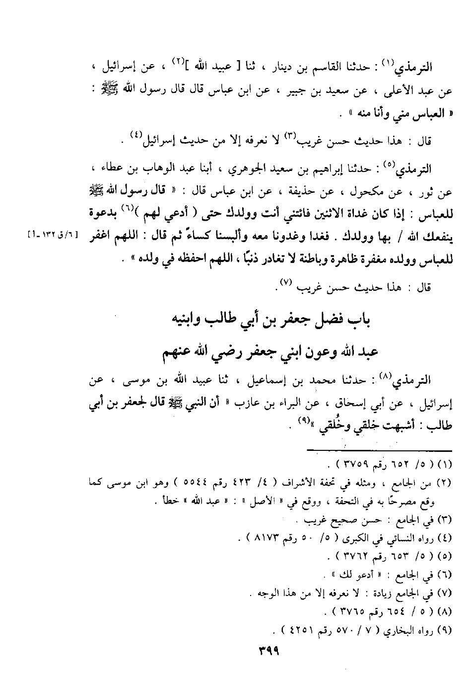 التِّرْمِذِيّ: حَدثنَا الْقَاسِم بن دِينَار، ثَنَا [عبيد الله] ، عَن إِسْرَائِيل، عَن عبد الْأَعْلَى، عَن سعيد بن جُبَير، عَن ابْن عَبَّاس قَالَ قَالَ رَسُول الله - صَلَّى اللَّهُ عَلَيْهِ وَسَلَّم َ -: " الْعَبَّاس مني وَأَنا مِنْهُ ".