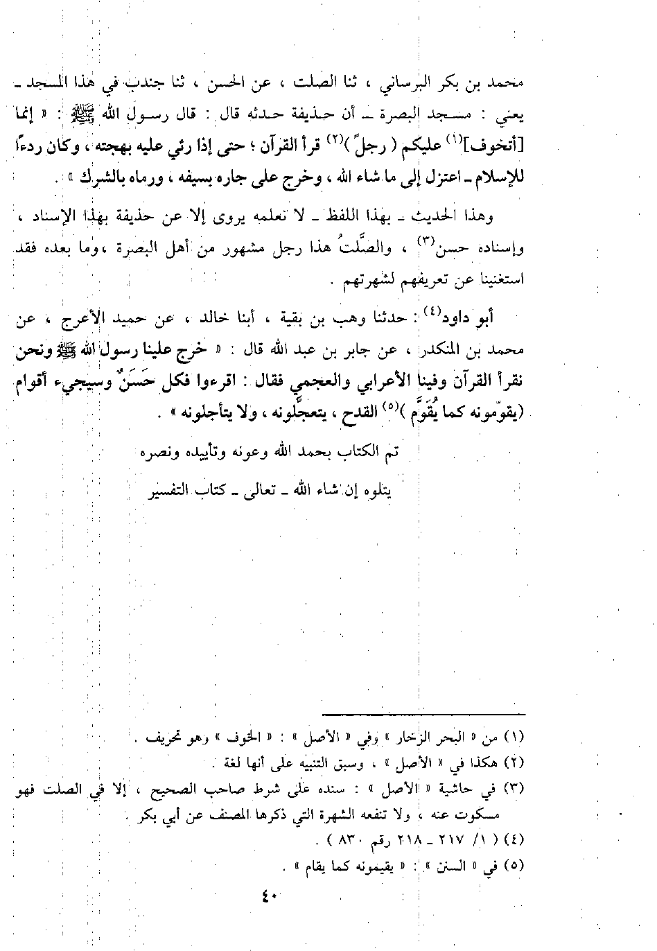 أَبُو دَاوُد: حَدثنَا وهب بن بَقِيَّة، أبنا خَالِد، عَن حميد الْأَعْرَج، عَن مُحَمَّد بن الْمُنْكَدر، عَن جَابر بن عبد الله قَالَ: " خرج علينا رَسُول الله - صَلَّى اللَّهُ عَلَيْهِ وَسَلَّم َ - وَنحن نَقْرَأ الْقُرْآن وَفينَا الْأَعرَابِي والعجمي فَقَالَ: اقْرَءُوا فَكل حسن وَسَيَجِيءُ أَقوام (يقومونه كَمَا يقوم) الْقدح، يتعجلونه، وَلَا يتأجلونه ".