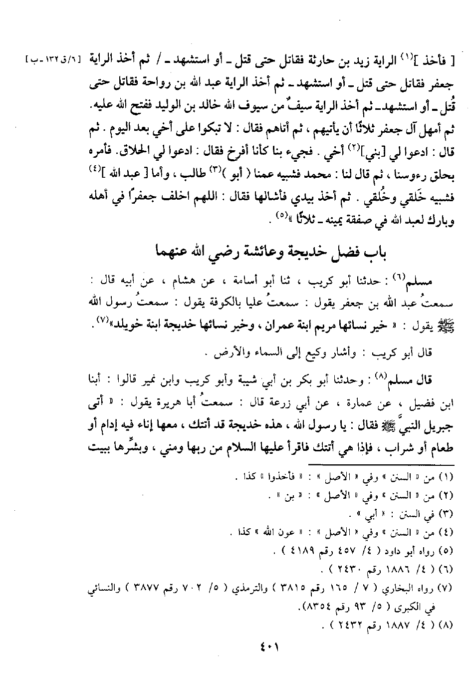 قَالَ مُسلم: وَحدثنَا أَبُو بكر بن أبي شيبَة وَأَبُو كريب وَابْن نمير قَالُوا: أبنا ابْن فُضَيْل، عَن عمَارَة، عَن أبي زرْعَة قَالَ: سَمِعت أَبَا هُرَيْرَة يَقُول: " أَتَى جِبْرِيل النَّبِي - صَلَّى اللَّهُ عَلَيْهِ وَسَلَّم َ - فَقَالَ: يَا رَسُول الله، هَذِه خَدِيجَة قد أتتك، مَعهَا إِنَاء فِيهِ إدام أَو طَعَام أَو شراب، فَإِذا هِيَ أتتك فاقرأ عَلَيْهَا السَّلَام من رَبهَا ومني، وبشرها بِبَيْت