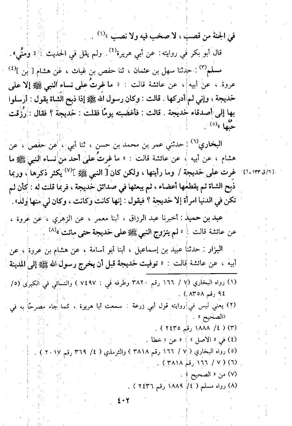البُخَارِيّ: حَدثنِي عمر بن مُحَمَّد بن حسن، ثَنَا أبي، عَن حَفْص، عَن هِشَام، عَن أَبِيه، عَن عَائِشَة قَالَت: " مَا غرت على أحد من نسَاء النَّبِي - صَلَّى اللَّهُ عَلَيْهِ وَسَلَّم َ - مَا غرت على خَدِيجَة / وَمَا رَأَيْتهَا، وَلَكِن كَانَ [النَّبِي - صَلَّى اللَّهُ عَلَيْهِ وَسَلَّم َ -] يكثر ذكرهَا، وَرُبمَا ذبح الشَّاة ثمَّ يقطعهَا أَعْضَاء، ثمَّ يبعثها فِي صدائق خَدِيجَة، فَرُبمَا قلت لَهُ: كَأَن لم تكن فِي الدُّنْيَا امْرَأَة إِلَّا خَدِيجَة؟ فَيَقُول: إِنَّهَا كَانَت وَكَانَت، وَكَانَ لي مِنْهَا ولدا ".