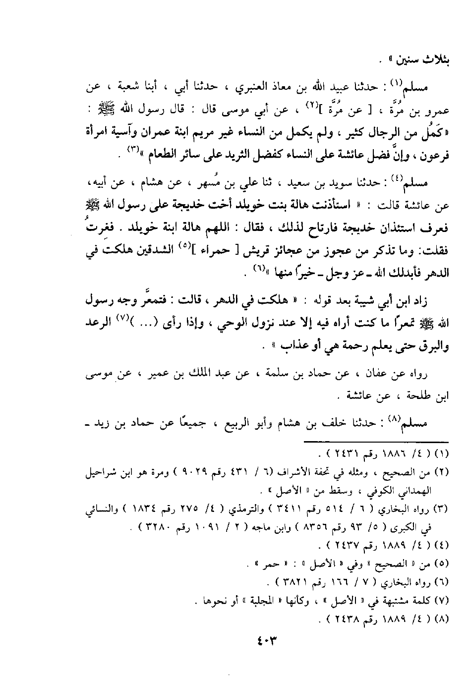 مُسلم: حَدثنَا عبيد الله بن معَاذ الْعَنْبَري، حَدثنَا أبي، أبنا شُعْبَة، عَن عَمْرو بن مرّة، [عَن مرّة] ، عَن أبي مُوسَى قَالَ: قَالَ رَسُول الله - صَلَّى اللَّهُ عَلَيْهِ وَسَلَّم َ -: " كمل من الرِّجَال كثير، وَلم يكمل من النِّسَاء غير مَرْيَم ابْنة عمرَان وآسية امْرَأَة فِرْعَوْن، وَإِن فضل عَائِشَة على النِّسَاء كفضل الثَّرِيد على سَائِر الطَّعَام ".