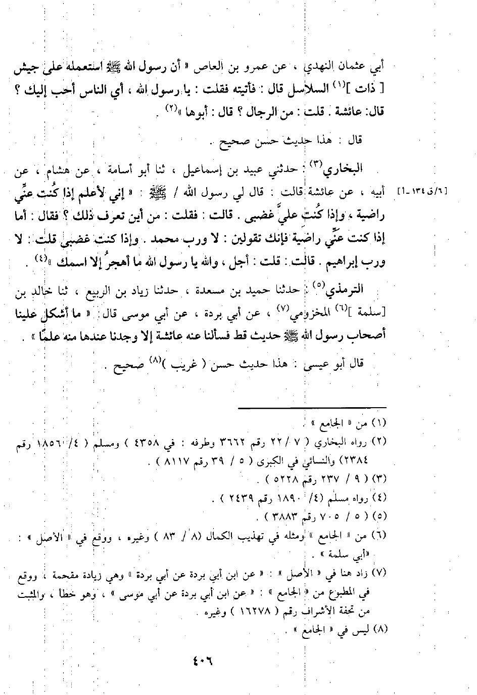 أبي عُثْمَان النَّهْدِيّ، عَن عَمْرو بن الْعَاصِ " أَن رَسُول الله - صَلَّى اللَّهُ عَلَيْهِ وَسَلَّم َ - اسْتَعْملهُ على جَيش [ذَات] السلَاسِل قَالَ: فَأَتَيْته فَقلت: يَا رَسُول الله، أَي النَّاس أحب إِلَيْك؟ قَالَ: عَائِشَة. قلت: من الرِّجَال؟ قَالَ: أَبوهَا ".