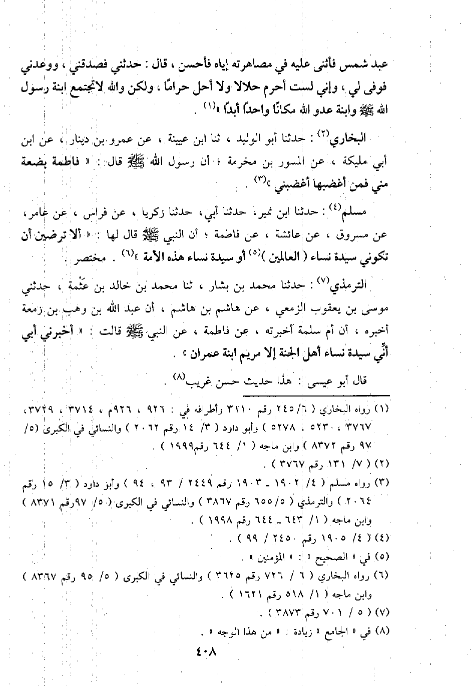 مُسلم: حَدثنَا ابْن نمير، حَدثنَا أبي، حَدثنَا زَكَرِيَّا، عَن فراس، عَن عَامر، عَن مَسْرُوق، عَن عَائِشَة، عَن فَاطِمَة؛ أَن النَّبِي - صَلَّى اللَّهُ عَلَيْهِ وَسَلَّم َ - قَالَ لَهَا: " أَلا ترْضينَ أَن تَكُونِي سيدة نسَاء (الْعَالمين) أَو سيدة نسَاء هَذِه الْأمة ". مُخْتَصر.