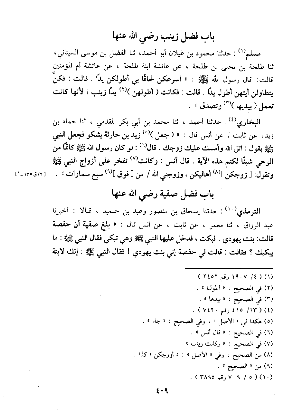 مُسلم: حَدثنَا مَحْمُود بن غيلَان أَبُو أَحْمد، ثَنَا الْفضل بن مُوسَى السينَانِي، ثَنَا طَلْحَة بن يحيى بن طَلْحَة، عَن عَائِشَة ابْنة طَلْحَة، عَن عَائِشَة أم الْمُؤمنِينَ قَالَت: قَالَ رَسُول الله - صَلَّى اللَّهُ عَلَيْهِ وَسَلَّم َ -: " أَسْرَعكُنَّ لحَاقًا بِي أَطْوَلكُنَّ يدا. قَالَت: فَكُن يَتَطَاوَلْنَ أيتها أطول يدا. قَالَت: فَكَانَت (أَطْوَلهنَّ) يدا زَيْنَب؛ لِأَنَّهَا كَانَت تعْمل (بِيَدَيْهَا) وَتصدق ".