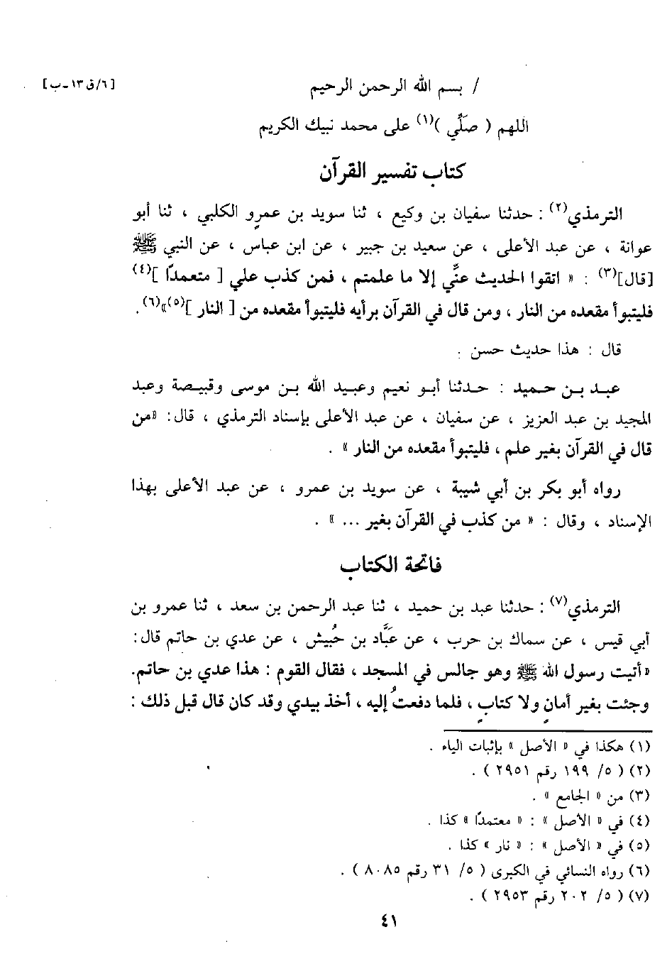التِّرْمِذِيّ: حَدثنَا سُفْيَان بن وَكِيع، ثَنَا سُوَيْد بن عَمْرو الْكَلْبِيّ، ثَنَا أَبُو عوَانَة، عَن عبد الْأَعْلَى، عَن سعيد بن جُبَير، عَن ابْن عَبَّاس، عَن النَّبِي - صَلَّى اللَّهُ عَلَيْهِ وَسَلَّم َ -[قَالَ] : " اتَّقوا الحَدِيث عني إِلَّا مَا علمْتُم، فَمن كذب عَليّ [مُتَعَمدا] فَليَتَبَوَّأ مَقْعَده من النَّار، وَمن قَالَ فِي الْقُرْآن بِرَأْيهِ فَليَتَبَوَّأ مَقْعَده من [النَّار] ".