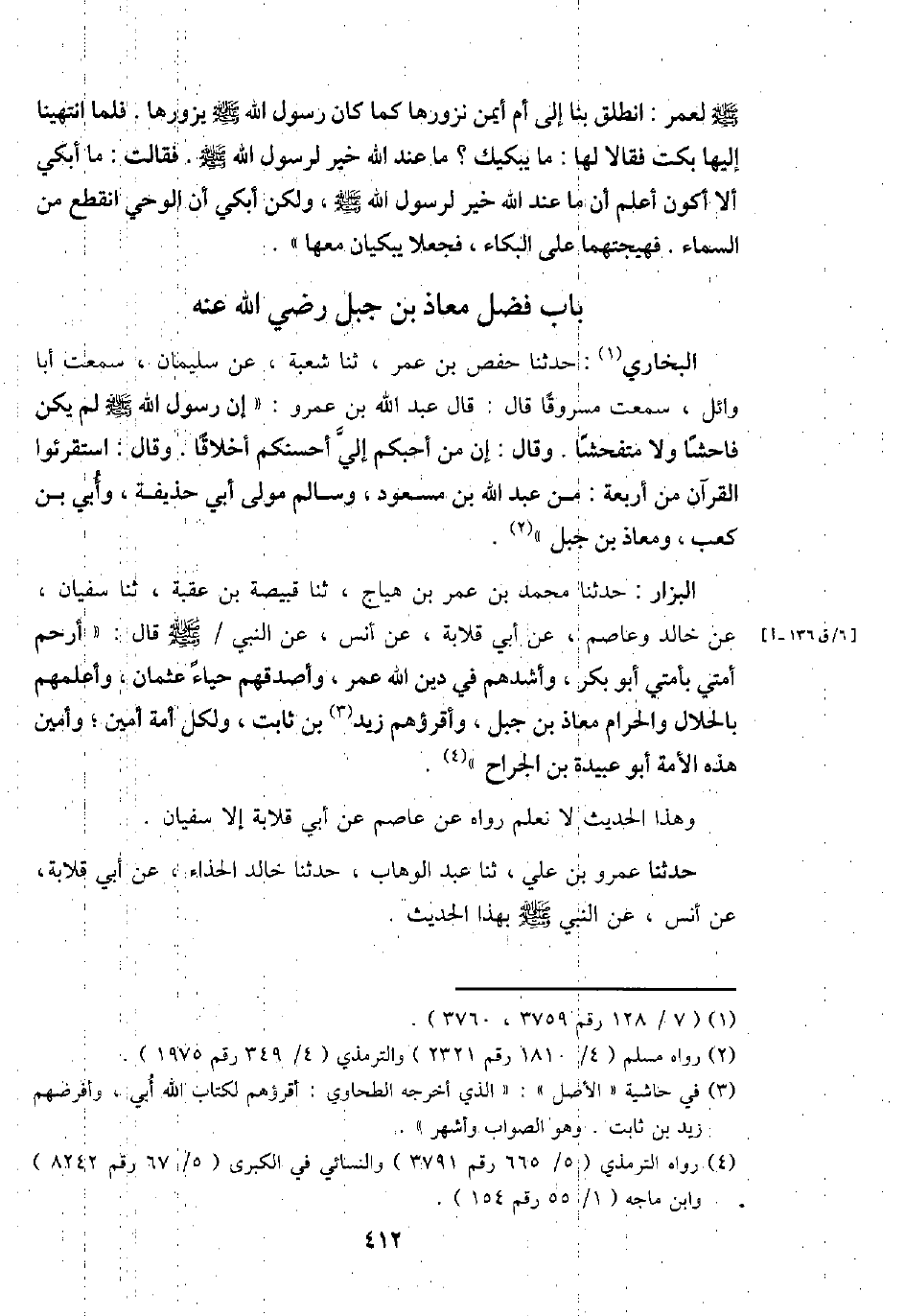 البُخَارِيّ: حَدثنَا حَفْص بن عمر، ثَنَا شُعْبَة، عَن سُلَيْمَان، سَمِعت أَبَا وَائِل، سَمِعت مسروقا قَالَ: قَالَ عبد الله بن عَمْرو: " إِن رَسُول الله - صَلَّى اللَّهُ عَلَيْهِ وَسَلَّم َ - لم يكن فَاحِشا وَلَا متفحشا. وَقَالَ: إِن من أحبكم إِلَيّ أحسنكم أَخْلَاقًا. وَقَالَ: استقرئوا الْقُرْآن من أَرْبَعَة: من عبد الله بن مَسْعُود، وَسَالم مولى أبي حُذَيْفَة، وَأبي بن كَعْب، ومعاذ بن جبل ".