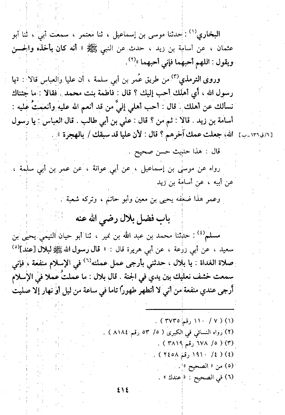 البُخَارِيّ: حَدثنَا مُوسَى بن إِسْمَاعِيل، ثَنَا مُعْتَمر، سَمِعت أبي، ثَنَا أَبُو عُثْمَان، عَن أُسَامَة بن زيد، حدث عَن النَّبِي - صَلَّى اللَّهُ عَلَيْهِ وَسَلَّم َ - " أَنه كَانَ يَأْخُذهُ وَالْحسن وَيَقُول: اللَّهُمَّ أحبهما فَإِنِّي أحبهما ".