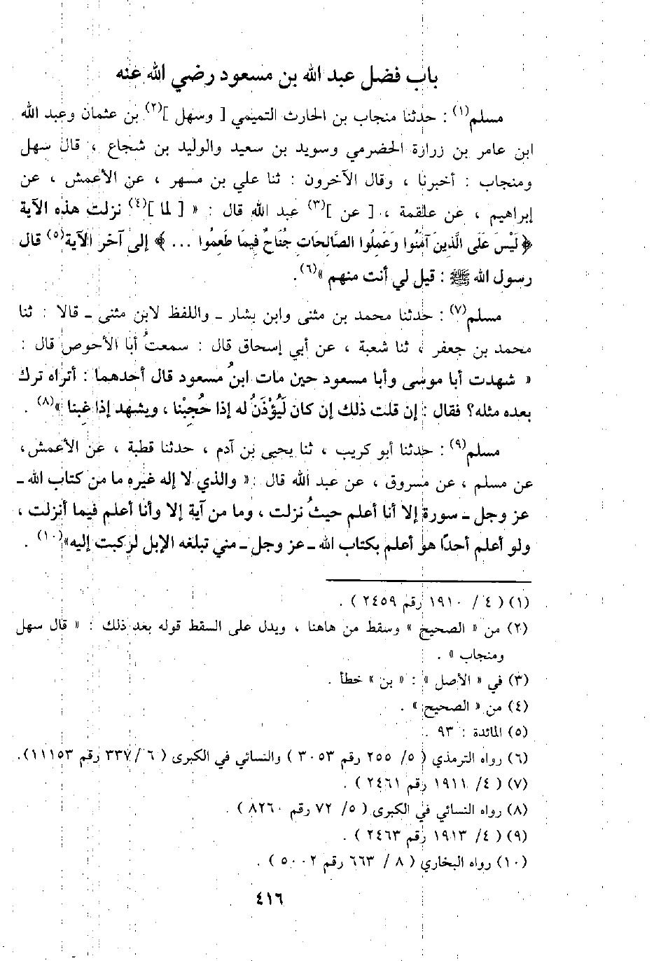 مُسلم: حَدثنَا منْجَاب بن الْحَارِث التَّمِيمِي [وَسَهل] بن عُثْمَان وَعبد الله ابْن عَامر بن زُرَارَة الْحَضْرَمِيّ وسُويد بن سعيد والوليد بن شُجَاع، قَالَ سهل ومنجاب: أخبرنَا، وَقَالَ الْآخرُونَ: ثَنَا عَليّ بن مسْهر، عَن الْأَعْمَش، عَن إِبْرَاهِيم، عَن عَلْقَمَة، [عَن] عبد الله قَالَ: " [لما] نزلت هَذِه الْآيَة {لَيْسَ على الَّذين آمنُوا وَعَلمُوا الصَّالِحَات جنَاح فِيمَا طعموا} إِلَى آخر الْآيَة قَالَ رَسُول الله - صَلَّى اللَّهُ عَلَيْهِ وَسَلَّم َ -: قيل لي أَنْت مِنْهُم ".