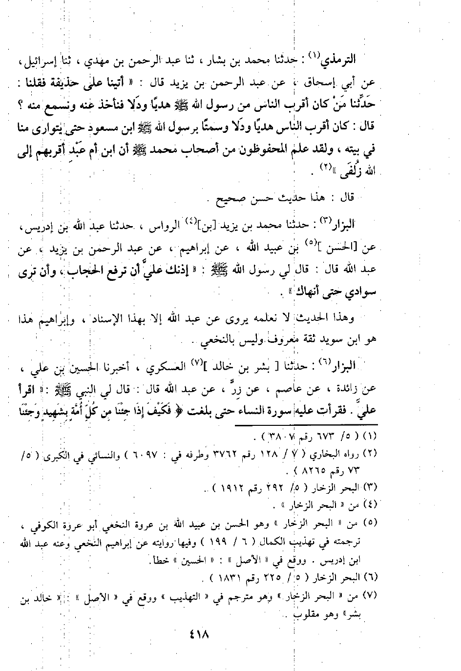 التِّرْمِذِيّ: حَدثنَا مُحَمَّد بن بشار، ثَنَا عبد الرَّحْمَن بن مهْدي، ثَنَا إِسْرَائِيل، عَن أبي إِسْحَاق، عَن عبد الرَّحْمَن بن يزِيد قَالَ: " أَتَيْنَا على حُذَيْفَة فَقُلْنَا: حَدثنَا من كَانَ أقرب النَّاس من رَسُول الله - صَلَّى اللَّهُ عَلَيْهِ وَسَلَّم َ - هَديا ودلا فنأخذ عَنهُ ونسمع مِنْهُ؟ قَالَ: كَانَ أقرب النَّاس هَديا ودلا وسمتا برَسُول الله - صَلَّى اللَّهُ عَلَيْهِ وَسَلَّم َ - ابْن مَسْعُود حَتَّى يتَوَارَى منا فِي بَيته، وَلَقَد علم المحفوظون من أَصْحَاب مُحَمَّد - صَلَّى اللَّهُ عَلَيْهِ وَسَلَّم َ - أَن ابْن أم عبد أقربهم إِلَى الله زلفى ".