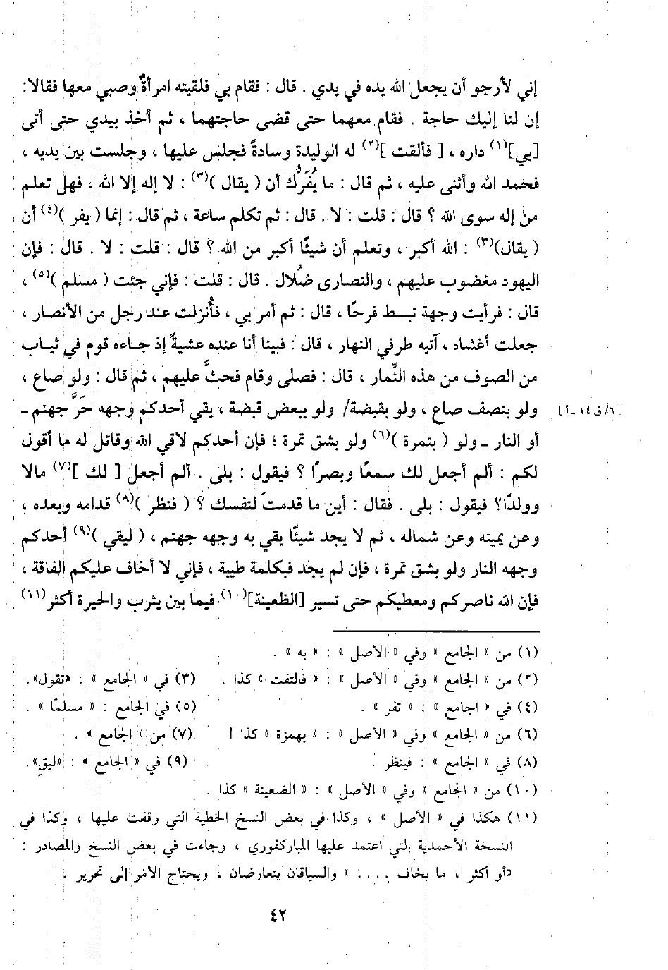 إِنِّي لأرجو أَن يَجْعَل الله يَده فِي يَدي. قَالَ: فَقَامَ بِي فَلَقِيته امْرَأَة وَصبي مَعهَا فَقَالَا: إِن لنا إِلَيْك حَاجَة. فَقَامَ مَعَهُمَا حَتَّى قضى حاجتهما، ثمَّ أَخذ بيَدي حَتَّى أَتَى [بِي] دَاره، [فَأَلْقَت] لَهُ الوليدة وسَادَة فَجَلَسَ عَلَيْهَا، وَجَلَست بَين يَدَيْهِ، فَحَمدَ الله وَأثْنى عَلَيْهِ، ثمَّ قَالَ: مَا يفرك أَن (يُقَال) : لَا إِلَه إِلَّا الله، فَهَل تعلم من إِلَه سوى الله؟ قَالَ: قلت: لَا. قَالَ: ثمَّ تكلم سَاعَة، ثمَّ قَالَ: إِنَّمَا (يفر) أَن (يُقَال) : الله أكبر، وَتعلم أَن شَيْئا أكبر من الله؟ قَالَ: قلت: لَا. قَالَ: فَإِن الْيَهُود مغضوب عَلَيْهِم، وَالنَّصَارَى ضلال. قَالَ: قلت: فَإِنِّي جِئْت (مُسلم) ، قَالَ: فَرَأَيْت وجهة تبسط فَرحا، قَالَ: ثمَّ أَمر بِي، فأنزلت عِنْد رجل من الْأَنْصَار، جعلت أغشاه، آتيه طرفِي النَّهَار، قَالَ: فَبينا أَنا عِنْده عَشِيَّة إِذْ جَاءَهُ قوم فِي ثِيَاب من الصُّوف من هَذِه النمار. قَالَ: فصلى وَقَامَ فَحَث عَلَيْهِم، ثمَّ قَالَ: وَلَو صَاع، وَلَو بِنصْف صَاع، وَلَو بقبضة / وَلَو بِبَعْض قَبْضَة، يقي أحدكُم وَجهه حر جَهَنَّم - أَو النَّار - وَلَو (بتمرة) وَلَو بشق تَمْرَة؛ فَإِن أحدكُم لاقي الله وَقَائِل لَهُ مَا أَقُول لكم: ألم أجعَل لَك سمعا وبصرا؟ فَيَقُول: بلَى. ألم أجعَل [لَك] مَالا وَولدا؟ فَيَقُول: بلَى. فَقَالَ: أَيْن مَا قدمت لنَفسك؟ (فَنظر) قدامه وَبعده، وَعَن يَمِينه وَعَن شِمَاله، ثمَّ لَا يجد شَيْئا يقي بِهِ وَجهه جَهَنَّم، (ليقي) أحدكُم وَجهه النَّار وَلَو بشق تَمْرَة، فَأن لم يجد فبكلمة طيبَة، فَإِنِّي لَا أَخَاف عَلَيْكُم الْفَاقَة، فَإِن الله ناصركم ومعطيكم حَتَّى تسير [الظعينة] فِيمَا بَين يثرب والحيرة أَكثر