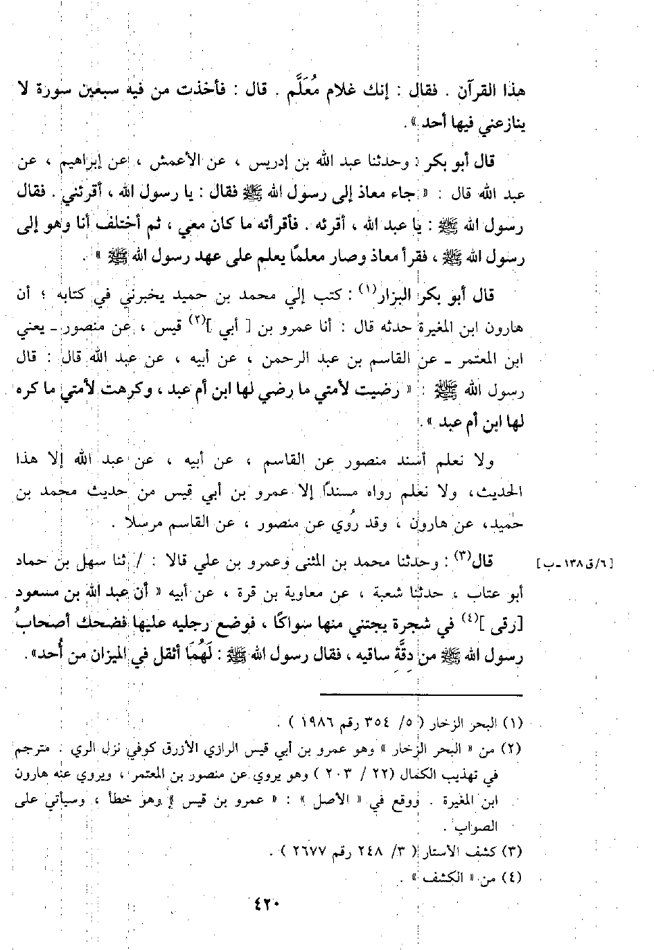 قَالَ أَبُو بكر الْبَزَّار: كتب إِلَيّ مُحَمَّد بن حميد يُخْبِرنِي فِي كِتَابه؛ أَن هَارُون ابْن الْمُغيرَة حَدثهُ قَالَ: أَنا عَمْرو بن [أبي] قيس، عَن مَنْصُور - يَعْنِي ابْن الْمُعْتَمِر - عَن الْقَاسِم بن عبد الرَّحْمَن، عَن أَبِيه، عَن عبد الله قَالَ: قَالَ رَسُول الله - صَلَّى اللَّهُ عَلَيْهِ وَسَلَّم َ -: " رضيت لأمتي مَا رَضِي لَهَا ابْن أم عبد، وكرهت لأمتي مَا كره لَهَا ابْن أم عبد ".