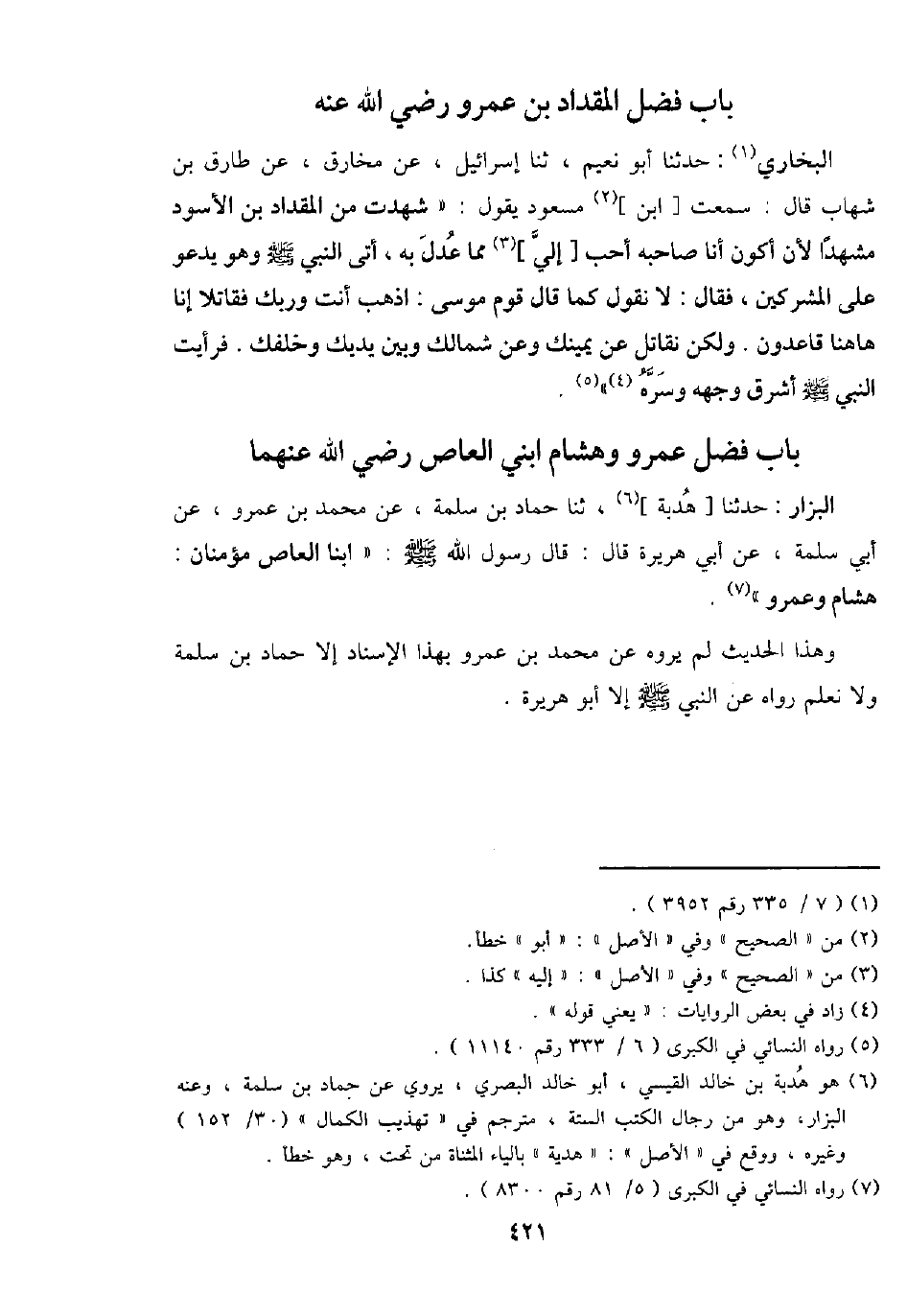 الْبَزَّار: حَدثنَا [هدبة] ، ثَنَا حَمَّاد بن سَلمَة، عَن مُحَمَّد بن عَمْرو، عَن أبي سَلمَة، عَن أبي هُرَيْرَة قَالَ: قَالَ رَسُول الله - صَلَّى اللَّهُ عَلَيْهِ وَسَلَّم َ -: " ابْنا الْعَاصِ مُؤْمِنَانِ: هِشَام وَعَمْرو ".
