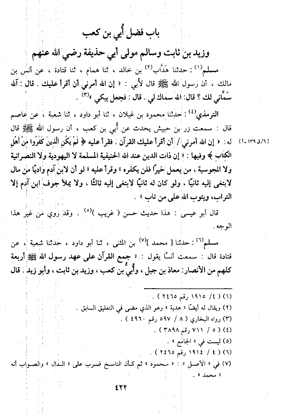 التِّرْمِذِيّ: حَدثنَا مَحْمُود بن غيلَان، ثَنَا أَبُو دَاوُد، ثَنَا شُعْبَة، عَن عَاصِم قَالَ: سَمِعت زر بن حُبَيْش يحدث عَن أبي بن كَعْب، أَن رَسُول الله - صَلَّى اللَّهُ عَلَيْهِ وَسَلَّم َ - قَالَ لَهُ: " إِن الله أَمرنِي / أَن أَقرَأ عَلَيْك الْقُرْآن. فَقَرَأَ عَلَيْهِ {لم يكن الَّذين كفرُوا من أهل الْكتاب} وفيهَا: " إِن ذَات الدَّين عِنْد الله الحنيفية الْمسلمَة لَا الْيَهُودِيَّة وَلَا النَّصْرَانِيَّة وَلَا الْمَجُوسِيَّة، من يعْمل خيرا فَلَنْ يكفره " وَقَرَأَ عَلَيْهِ " لَو أَن لِابْنِ آدم وَاديا من مَال لابتغى إِلَيْهِ ثَانِيًا، وَلَو كَانَ لَهُ ثَانِيًا لابتغى إِلَيْهِ ثَالِثا، وَلَا يمْلَأ جَوف ابْن آدم إِلَّا التُّرَاب، وَيَتُوب الله على من تَابَ ".