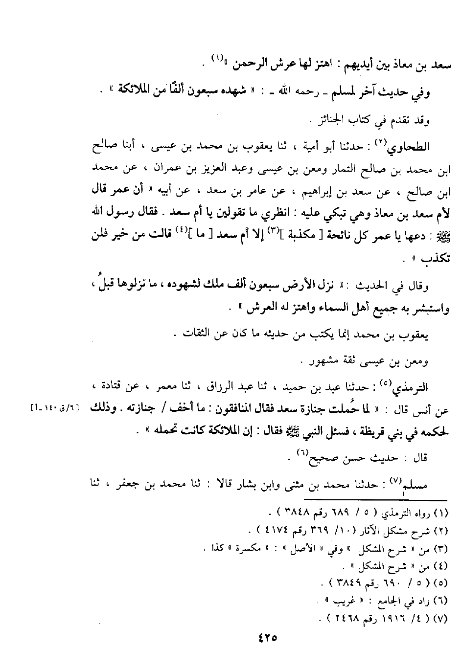التِّرْمِذِيّ: حَدثنَا عبد بن حميد، ثَنَا عبد الرَّزَّاق، ثَنَا معمر، عَن قَتَادَة، عَن أنس قَالَ: " لما حملت جَنَازَة سعد فَقَالَ المُنَافِقُونَ: مَا أخف / جنَازَته. وَذَلِكَ لحكمه فِي بني قُرَيْظَة، فَسئلَ النَّبِي - صَلَّى اللَّهُ عَلَيْهِ وَسَلَّم َ - فَقَالَ: إِن الْمَلَائِكَة كَانَت تحمله ".