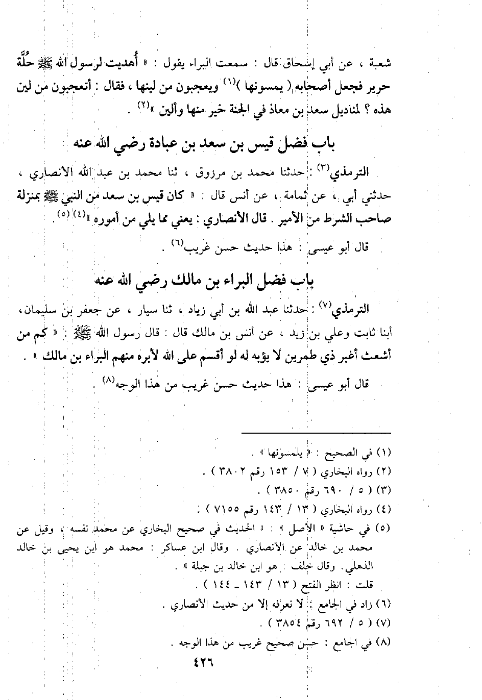 شُعْبَة، عَن أبي إِسْحَاق قَالَ: سَمِعت الْبَراء يَقُول: " أهديت لرَسُول الله - صَلَّى اللَّهُ عَلَيْهِ وَسَلَّم َ - حلَّة حَرِير فَجعل أَصْحَابه (يمسونها) ويعجبون من لينها، فَقَالَ: أتعجبون من لين هَذِه؟ لمناديل سعد بن معَاذ فِي الْجنَّة خير مِنْهَا وألين ".