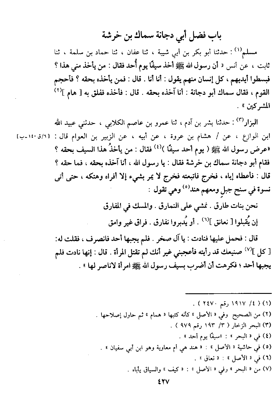 مُسلم: حَدثنَا أَبُو بكر بن أبي شيبَة، ثَنَا عَفَّان، ثَنَا حَمَّاد بن سَلمَة، ثَنَا ثَابت، عَن أنس " أَن رَسُول الله - صَلَّى اللَّهُ عَلَيْهِ وَسَلَّم َ - أَخذ سَيْفا يَوْم أحد فَقَالَ: من يَأْخُذ مني هَذَا؟ فبسطوا أَيْديهم، كل إِنْسَان مِنْهُم يَقُول: أَنا أَنا. قَالَ: فَمن يَأْخُذهُ بِحقِّهِ؟ فأحجم الْقَوْم، فَقَالَ سماك بن دُجَانَة: أَنا آخذه بِحقِّهِ. قَالَ: فَأَخذه ففلق بِهِ [هام] الْمُشْركين ".