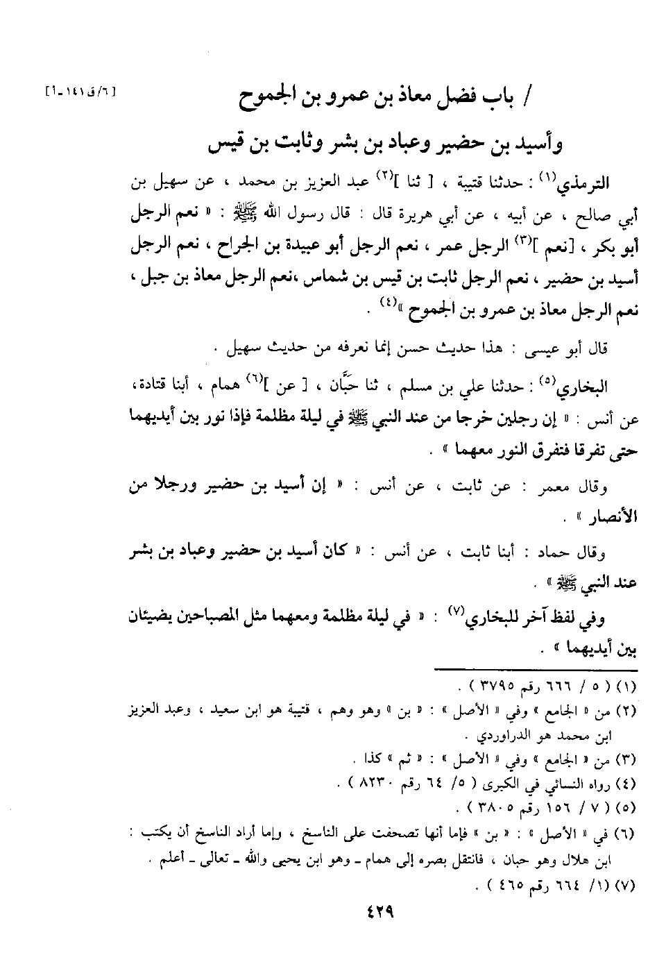 التِّرْمِذِيّ: حَدثنَا قُتَيْبَة، [ثَنَا] عبد الْعَزِيز بن مُحَمَّد، عَن سُهَيْل بن أبي صَالح، عَن أَبِيه، عَن أبي هُرَيْرَة قَالَ: قَالَ رَسُول الله - صَلَّى اللَّهُ عَلَيْهِ وَسَلَّم َ -: " نعم الرجل أَبُو بكر، [نعم] الرجل عمر، نعم الرجل أَبُو عُبَيْدَة بن الْجراح، نعم الرجل أسيد بن حضير، نعم الرجل ثَابت بن قيس بن شماس، نعم الرجل معَاذ بن جبل، نعم الرجل معَاذ بن عَمْرو بن الجموح ".
